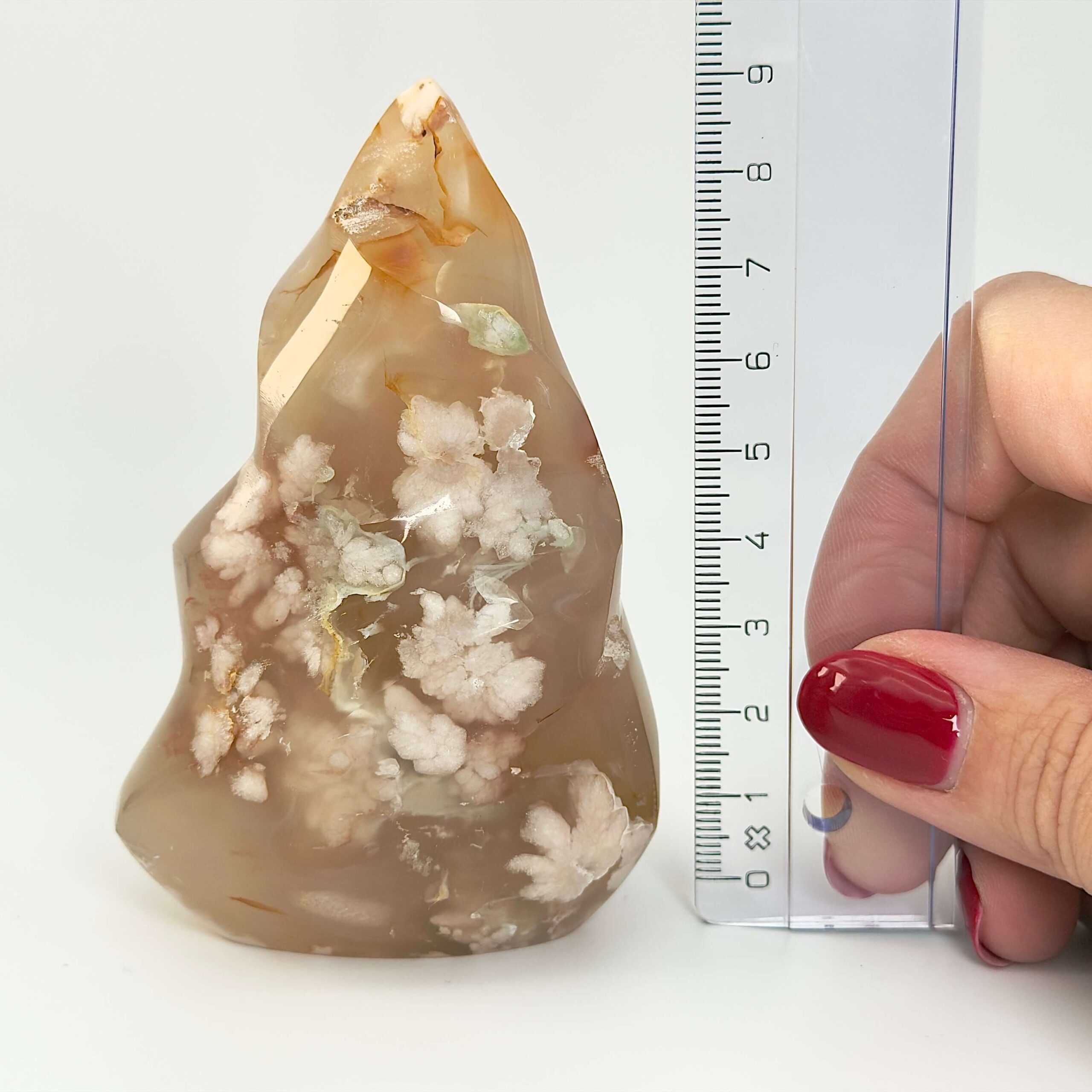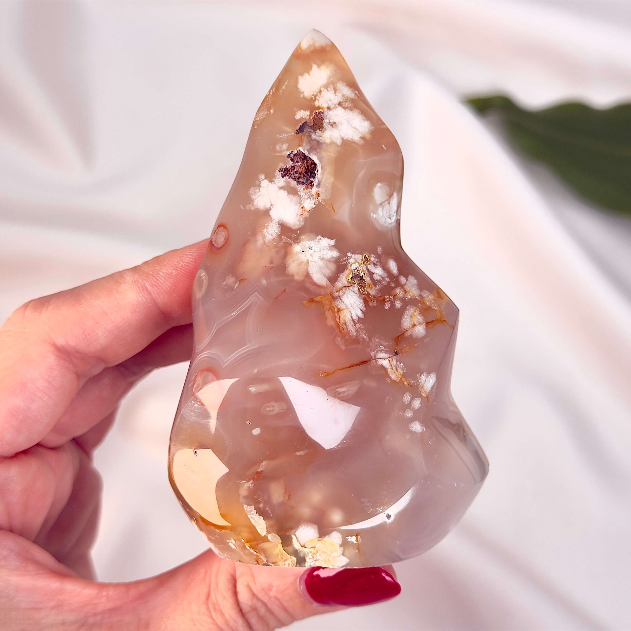 Agat blomst freeform indeholder en unik kombination af agatens jordforbindelse og chalcedonens blide, nærende energi, og derfor arbejder den både stabiliserende og opløftende på samme tid. Agat Blomst inviterer dig til at sænke tempoet, slippe følelsesmæssige spændinger og vende tilbage til et sted af indre harmoni. Den minder dig om, at heling ofte sker i små skridt, og at blomstring starter indefra.