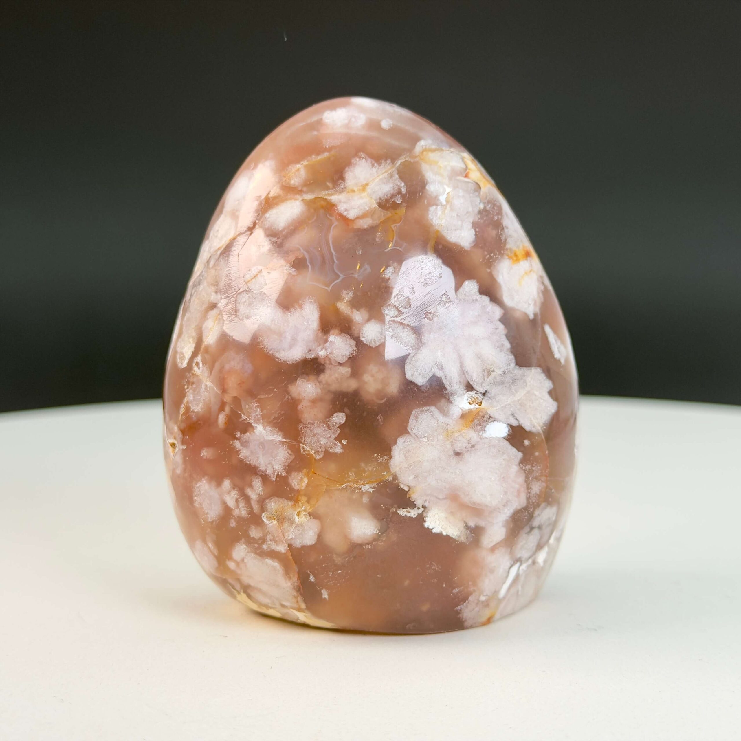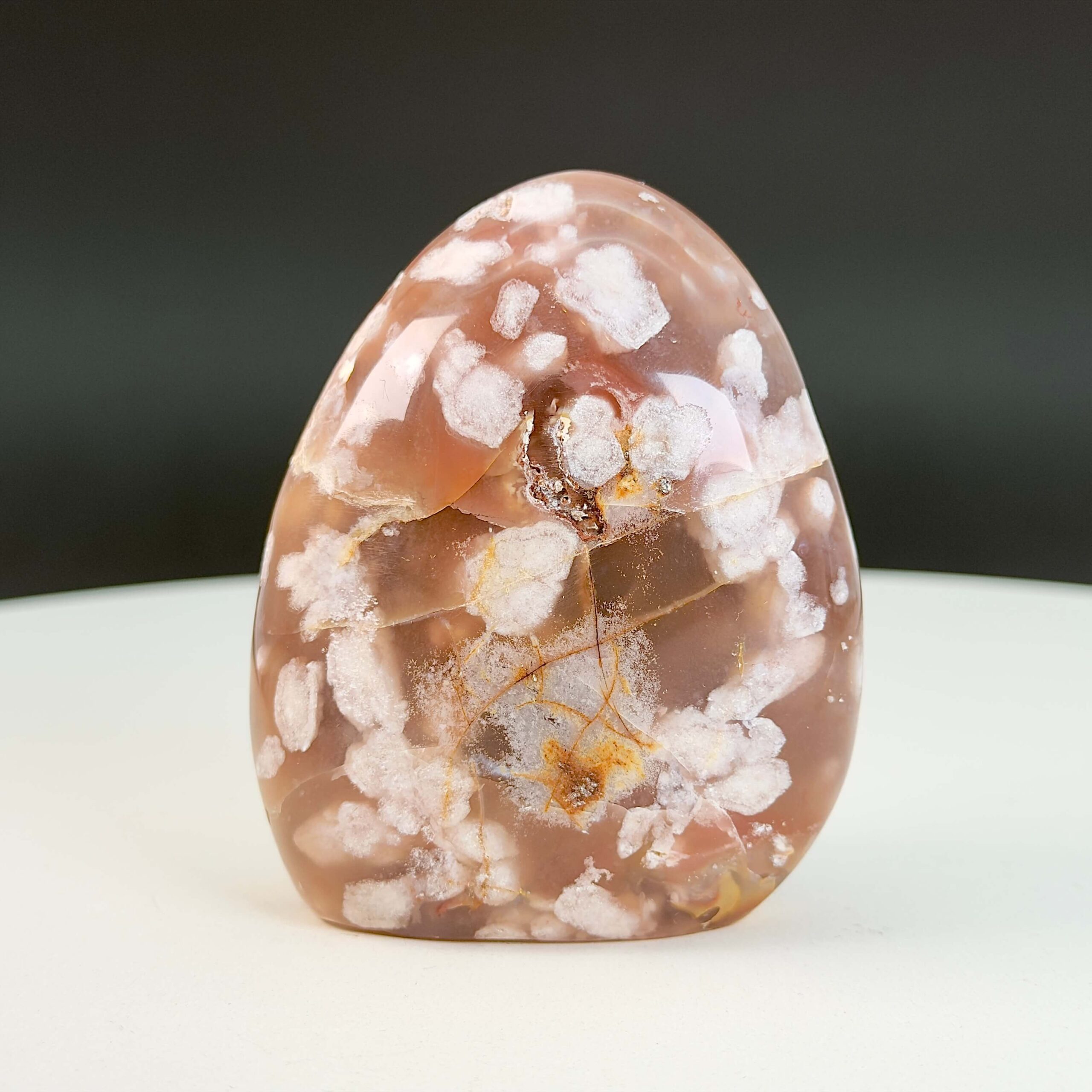 Agat blomst freeform indeholder en unik kombination af agatens jordforbindelse og chalcedonens blide, nærende energi, og derfor arbejder den både stabiliserende og opløftende på samme tid. Agat Blomst inviterer dig til at sænke tempoet, slippe følelsesmæssige spændinger og vende tilbage til et sted af indre harmoni. Den minder dig om, at heling ofte sker i små skridt, og at blomstring starter indefra.