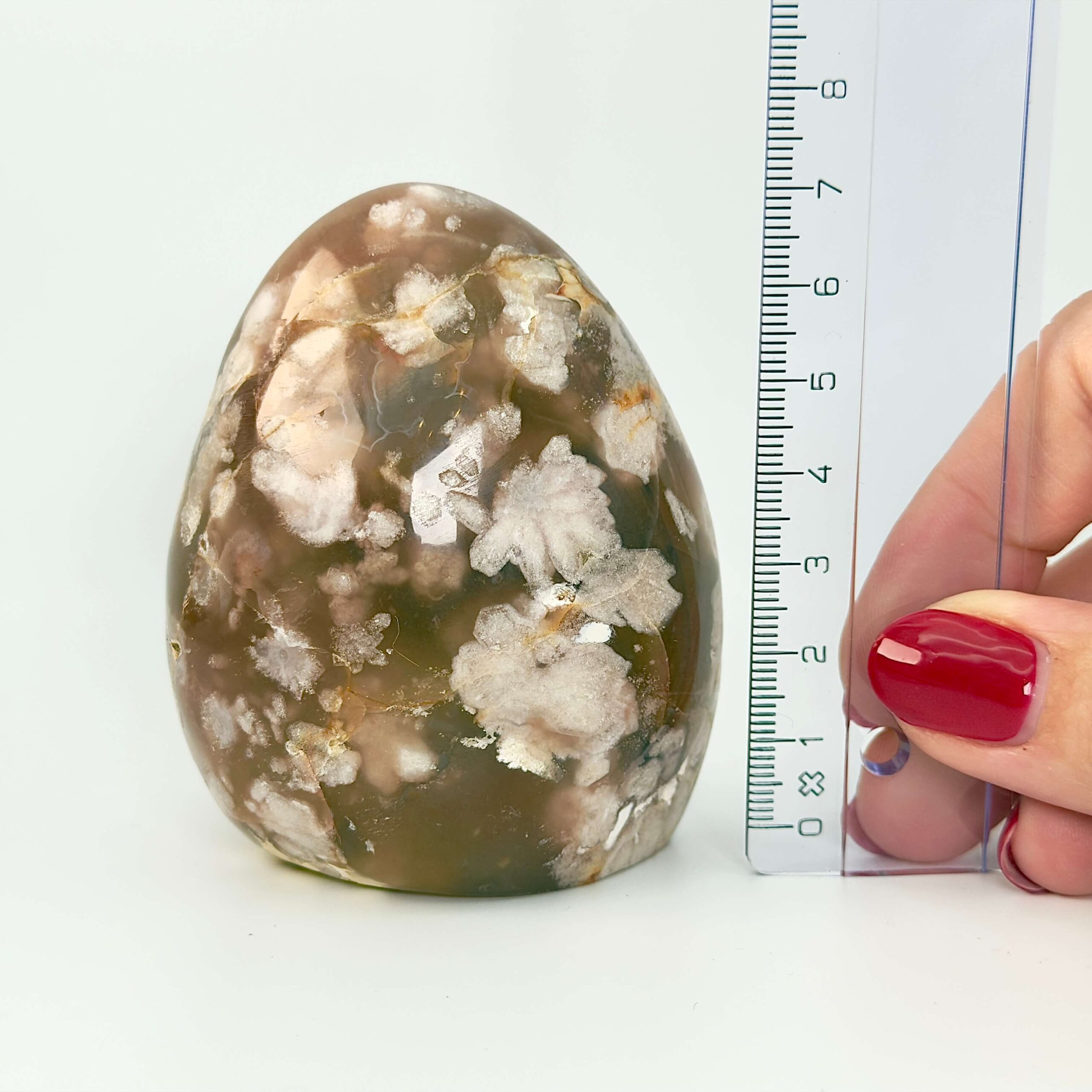 I hjemmet skaber Agat Blomst en fredfyldt atmosfære, der mindsker stress og giver plads til ro og nærvær. Den er også oplagt som lommesten eller bekymringssten, da dens glatte, bløde overflade giver en beroligende fysisk fornemmelse ved berøring. Agat Blomst er stenen for dig, der ønsker mere mildhed, styrke og følelsesmæssig balance. En sten, der hjælper dig med at blomstre – i dit eget tempo. Denne Agat Blomst freeform er i kategorien one-of-a-kind, det vil sige at det er krystallen på billederne du køber. Prisen er for den éne krystal. Freeformen måler 7,5 cm i højden og vejer 308g.