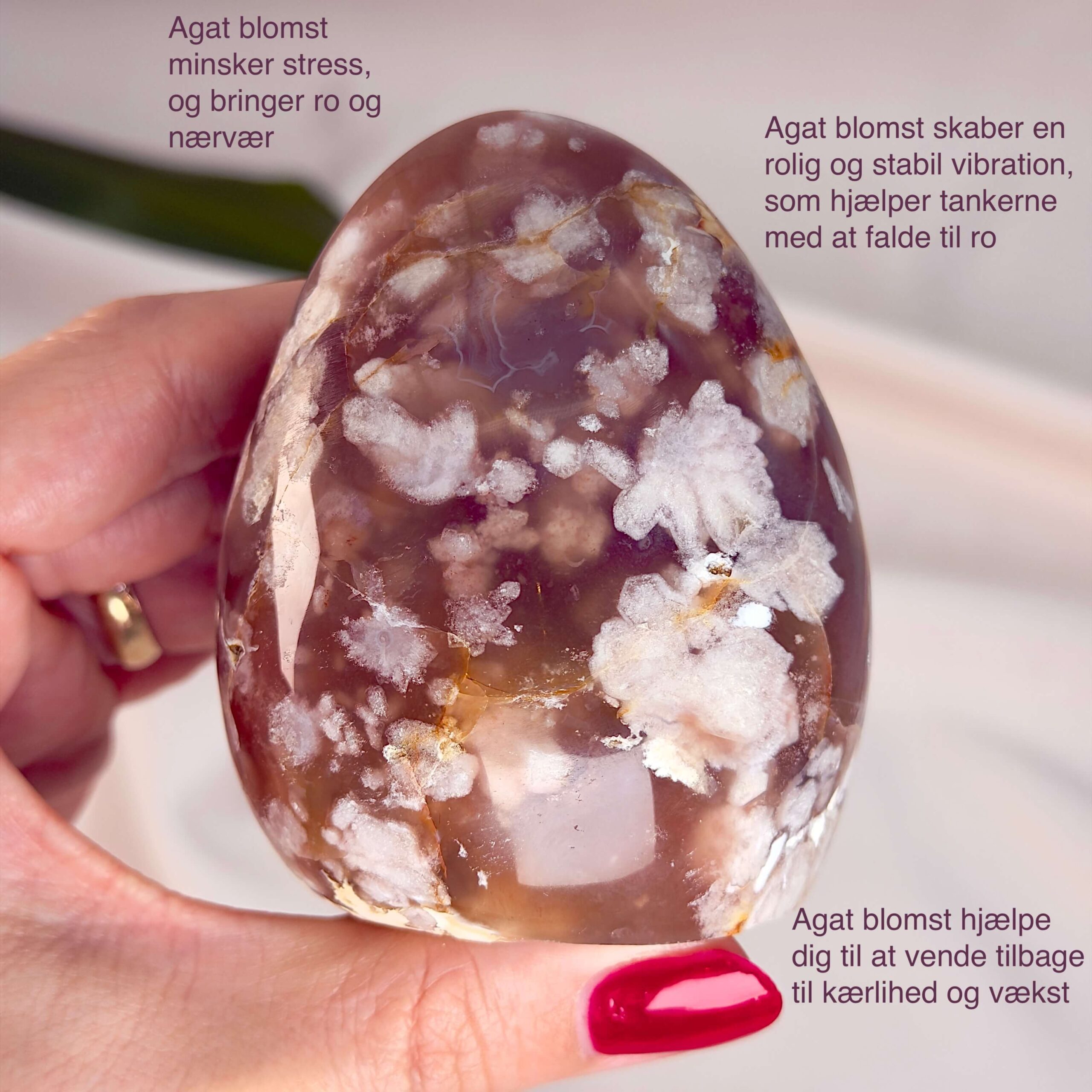 Agat Blomst er stenen for dig, der ønsker mere mildhed, styrke og følelsesmæssig balance. En sten, der hjælper dig med at blomstre – i dit eget tempo.