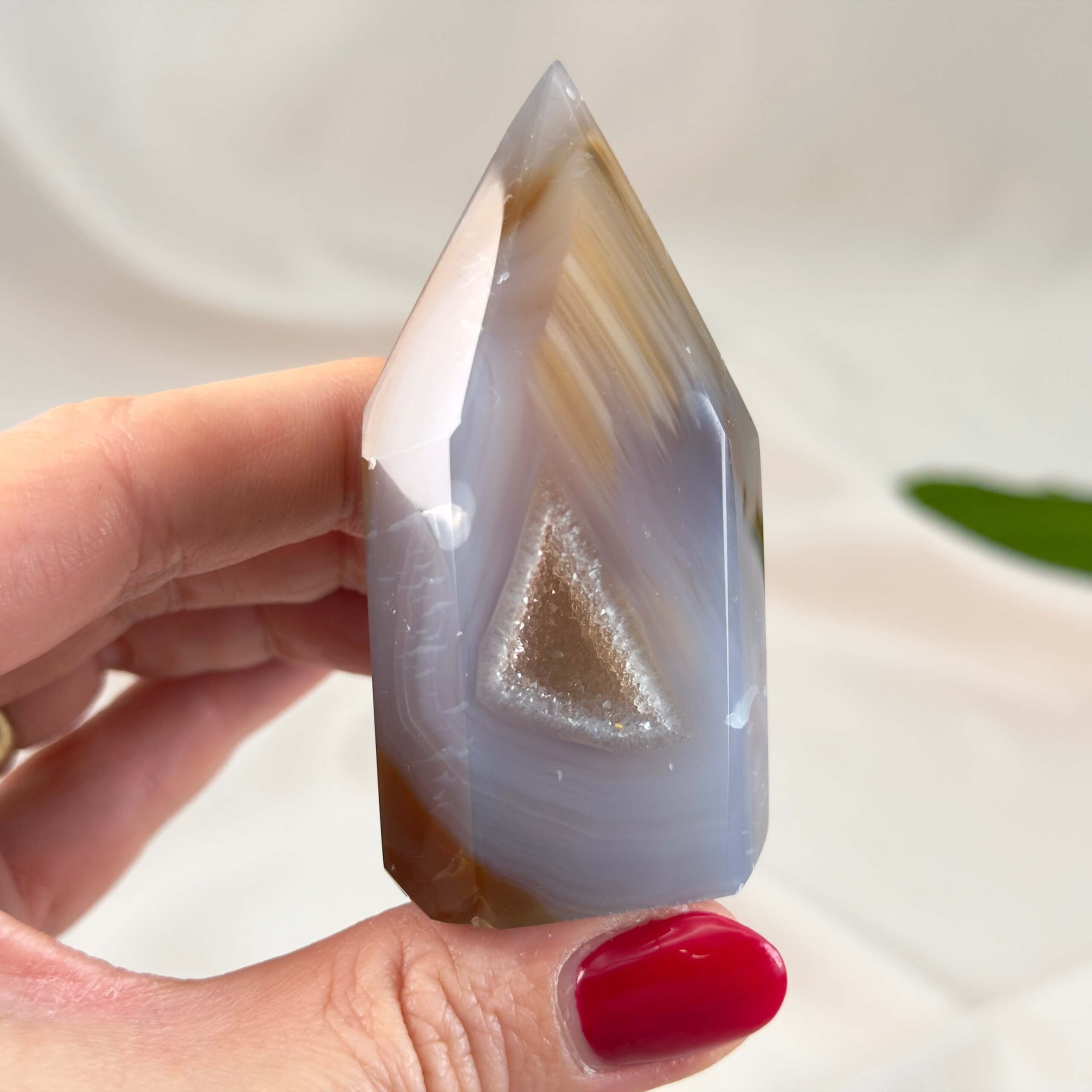 Agat Druzy tårn arbejder primært i Hjertechakra og Halschakra, hvor den skaber ro, ærlig kommunikation og følelsesmæssig balance.