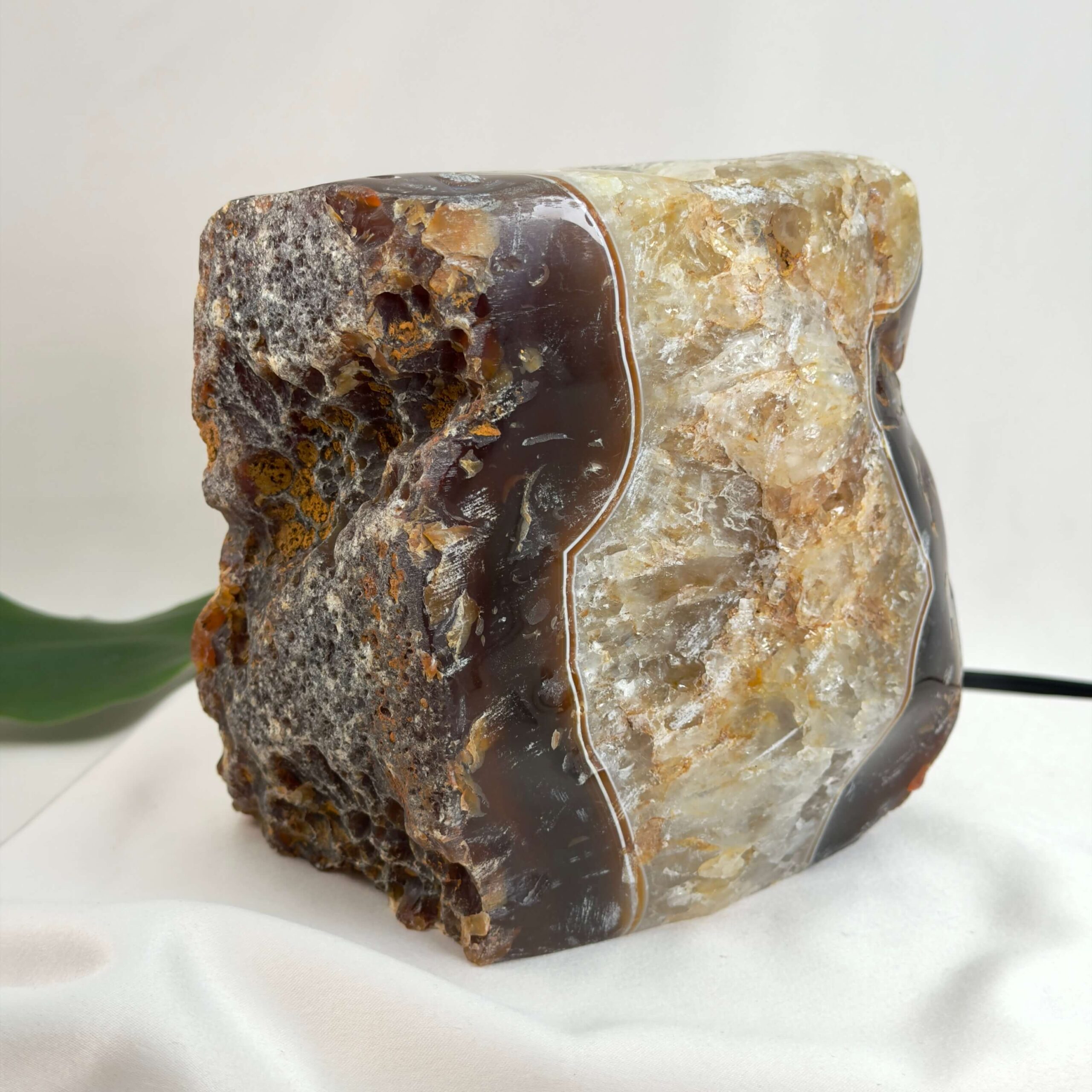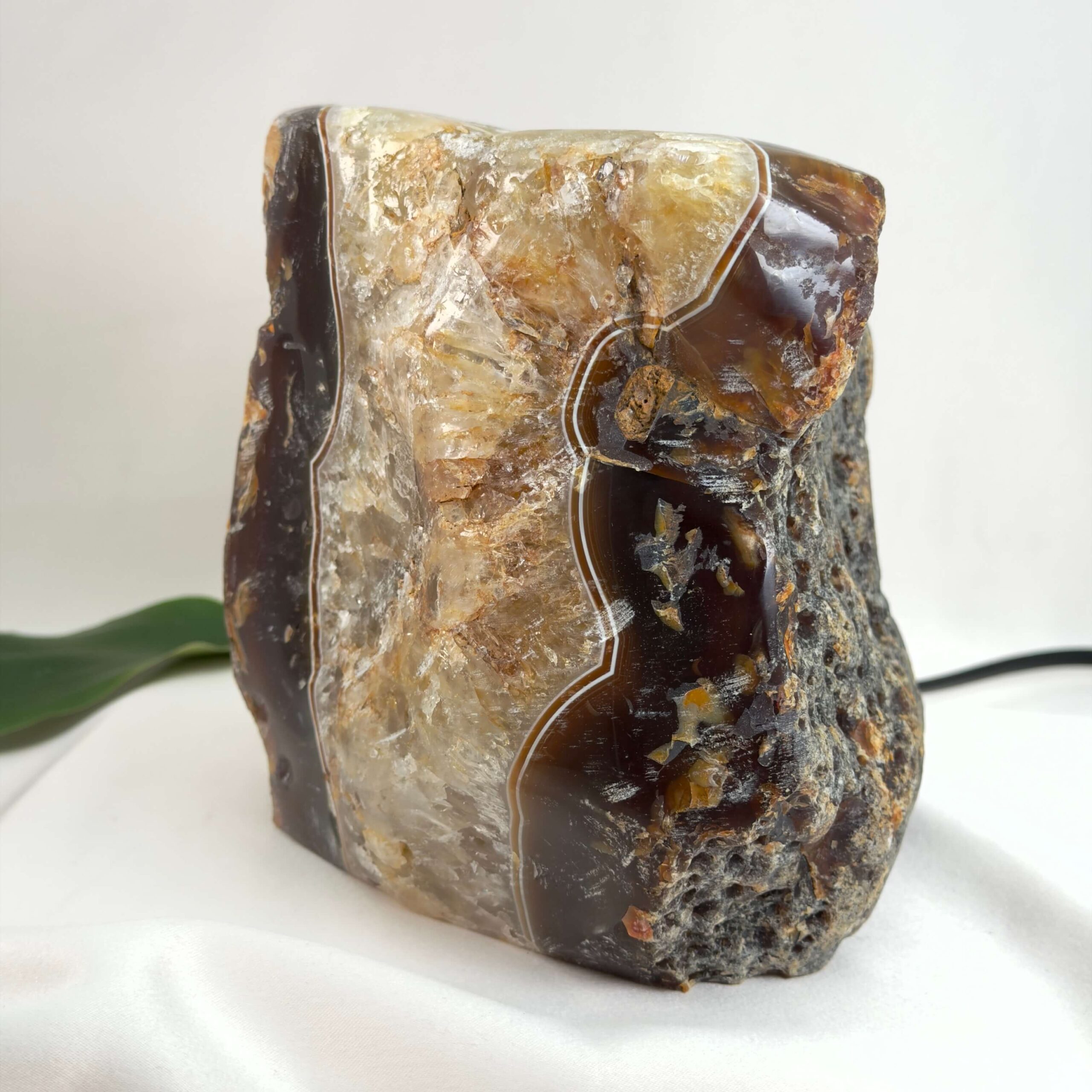 Lyset trænger gennem agatens naturlige lag og skaber en varm, levende glød, som ændrer sig afhængigt af stenen.