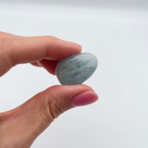 Disse Akvamarin er håndpoleret og derfor klare, glatte og meget smukke i deres udformning. De er afrundet i hjørnerne og perfekte til at have med som lommesten. Pga. håndpoleringen er den lækker at røre ved og ligger godt i hånden, hvilket giver en beroligende, “stressball”-agtig effekt. Den fungerer super godt både til mindfuld berøring og som støtte i meditation.