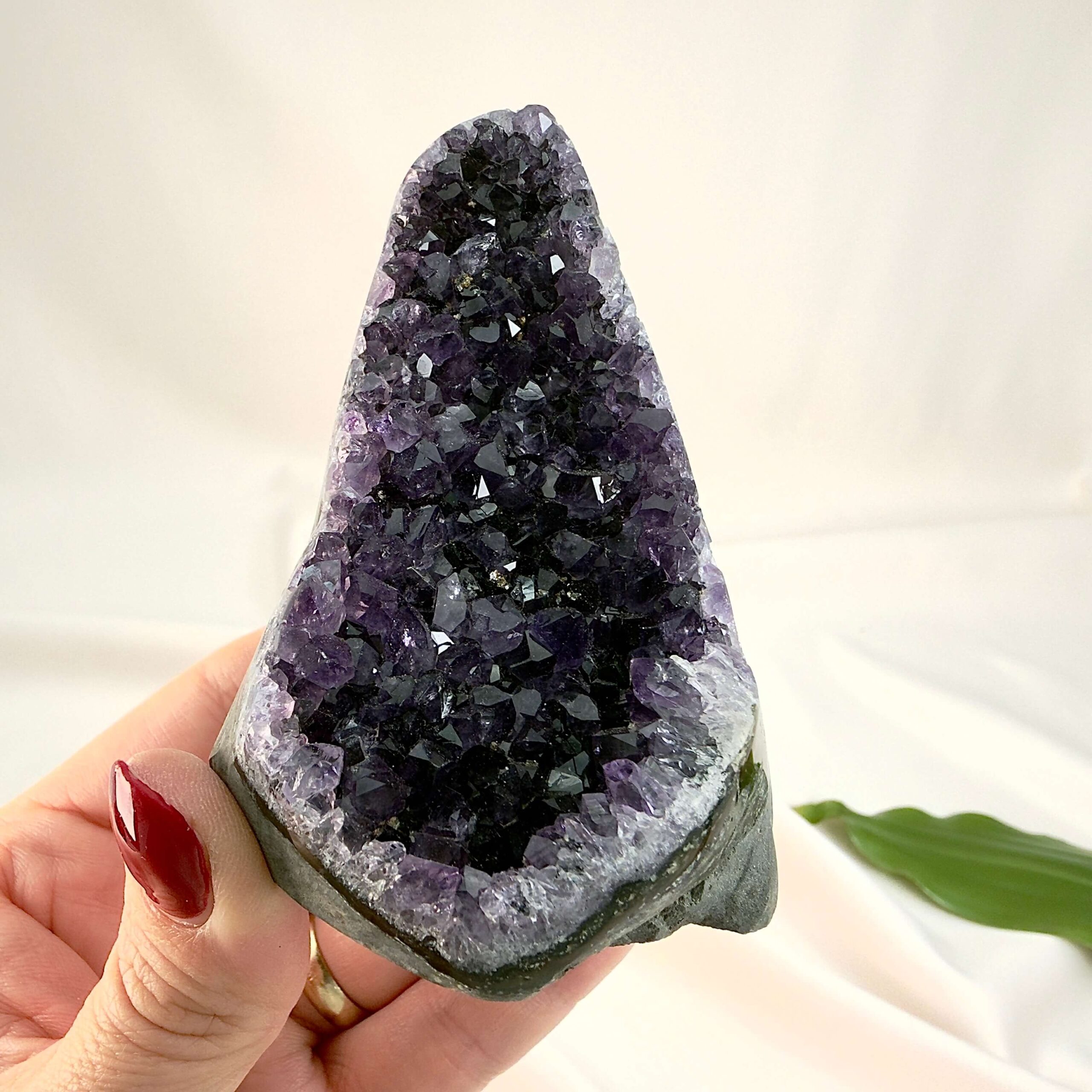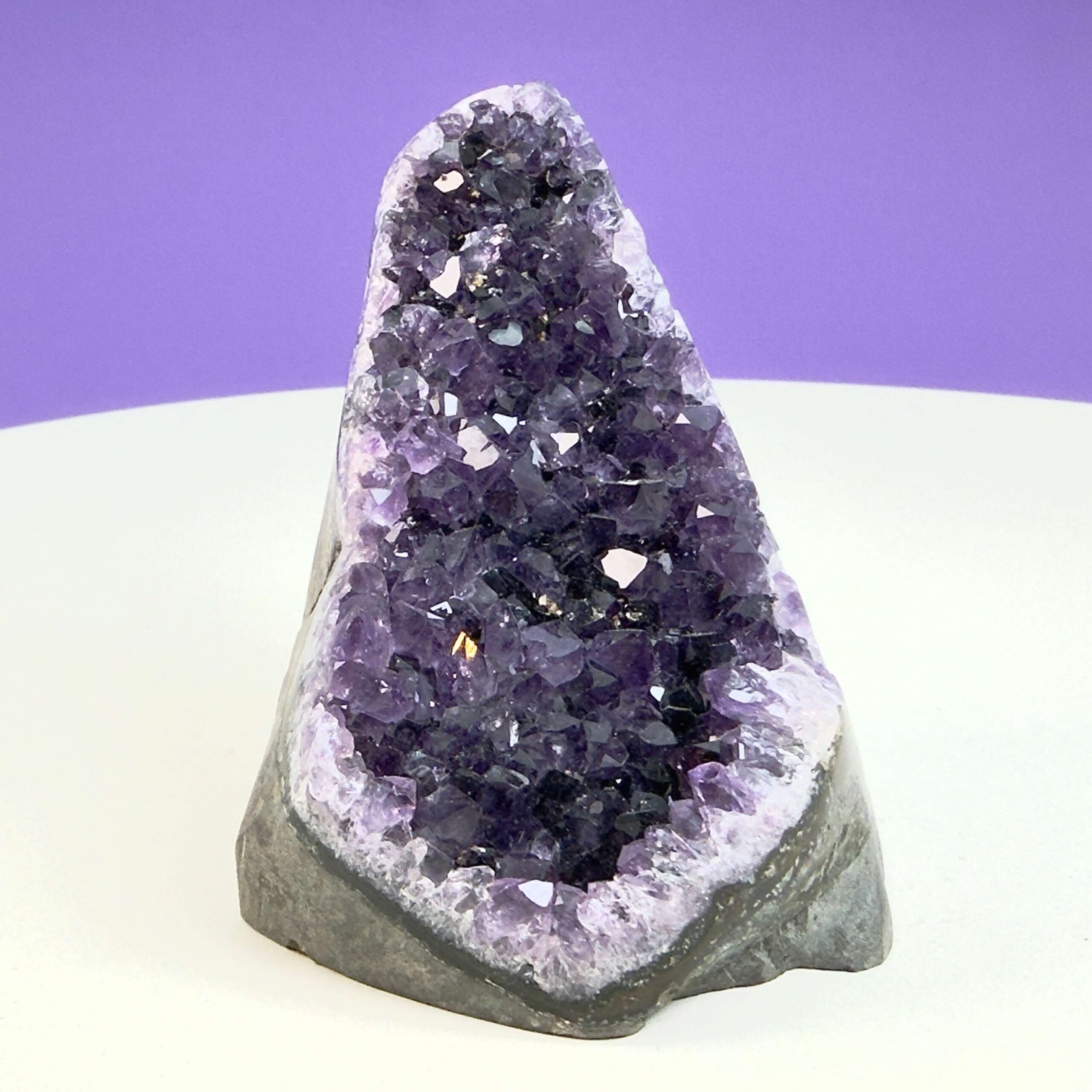 Ametyst er en af de mest ikoniske og elskede krystaller. En sten, der gennem årtusinder har været forbundet med åndelig klarhed, ro og beskyttelse. Med sine dybe violette nuancer udstråler den både mystik og harmoni. Ametyst er en af de vigtigste sten til meditation og spirituel udvikling. Den åbner forbindelsen til intuition, hjælper med at slippe negative mønstre og styrker evnen til at stole på din egen indre stemme. Den bliver også brugt af mange til at dæmpe stress, uro og søvnbesvær, og den kaldes ofte for “anti-stress-stenen”. Denne Ametyst grotte er i kategorien one-of-a-kind, hvilket betyder, at det er grotten på billedet du køber. Prisen er for den ene krystal.