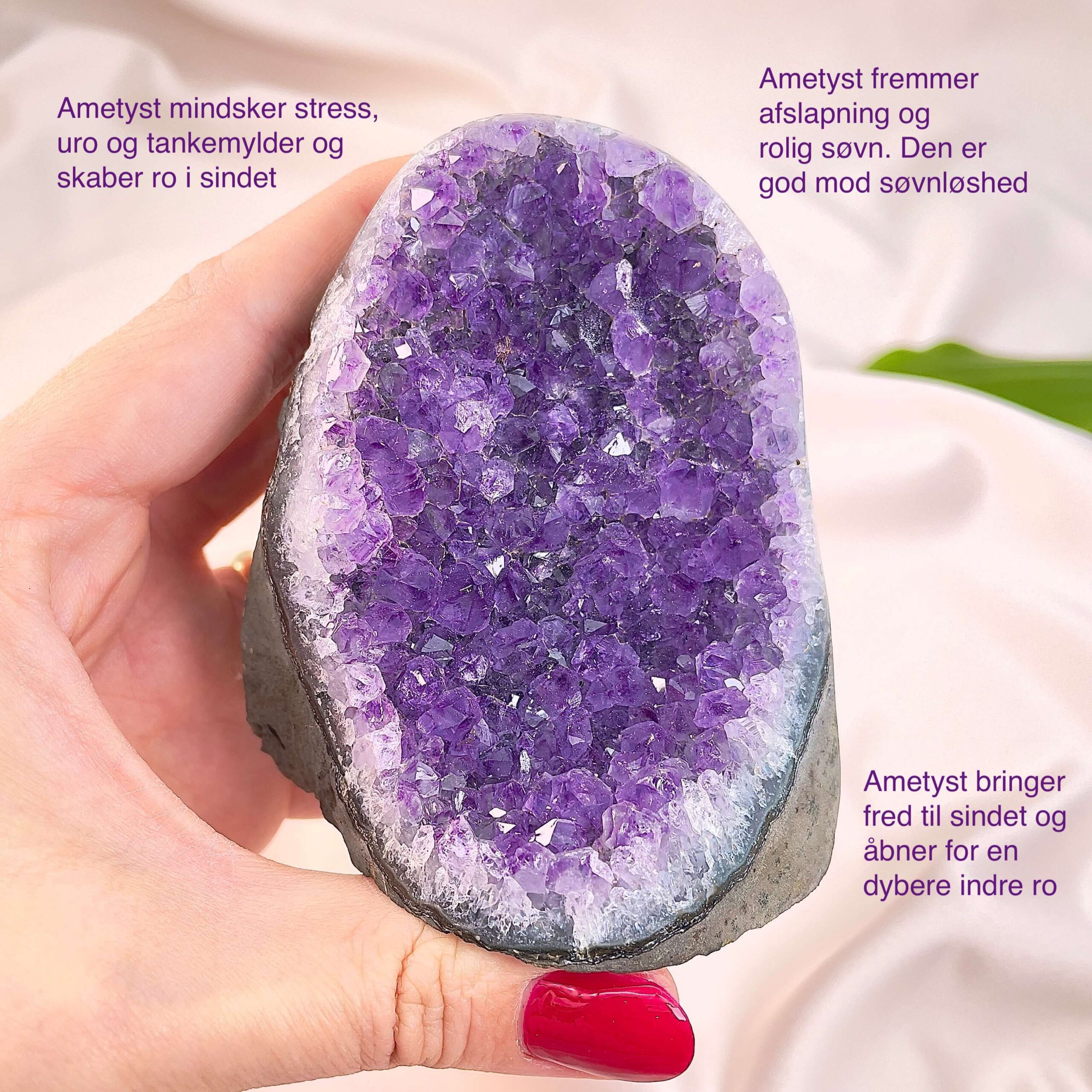 Energetisk balancerer Ametyst sindet og hjælper med at opnå en dybere selvindsigt. Den giver styrke til at slippe afhængigheder, gamle mønstre og destruktive tanker og den forbindes derfor både med spirituel vækst og praktisk livshjælp. Når livet føles kaotisk, giver en Ametyst grotte et fast holdepunkt og minder dig om, at ro findes indeni.