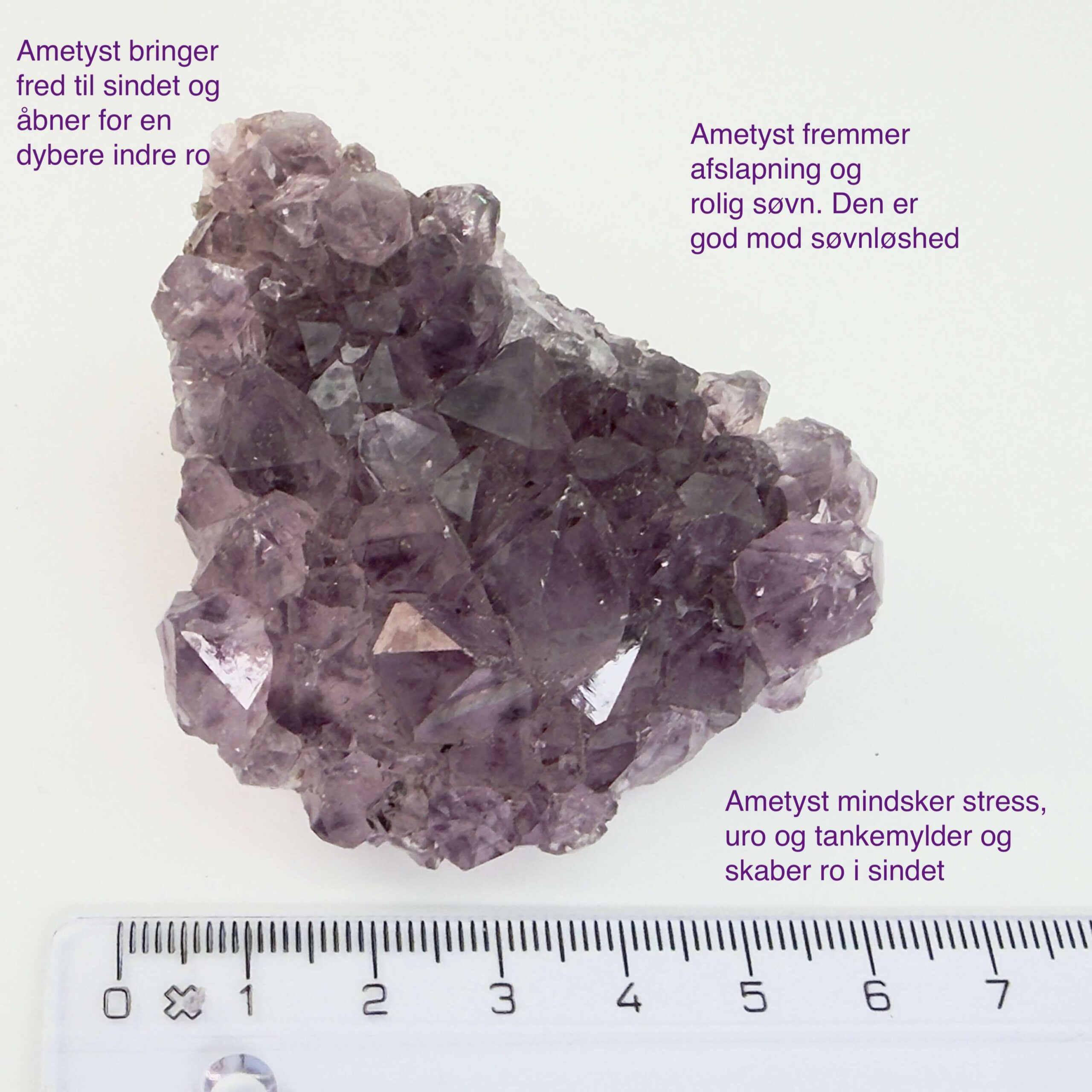 Energetisk balancerer Ametyst sindet og hjælper med at opnå en dybere selvindsigt. Den giver styrke til at slippe afhængigheder, gamle mønstre og destruktive tanker og den forbindes derfor både med spirituel vækst og praktisk livshjælp. Når livet føles kaotisk, giver en Ametyst klynge et fast holdepunkt og minder dig om, at ro findes indeni.