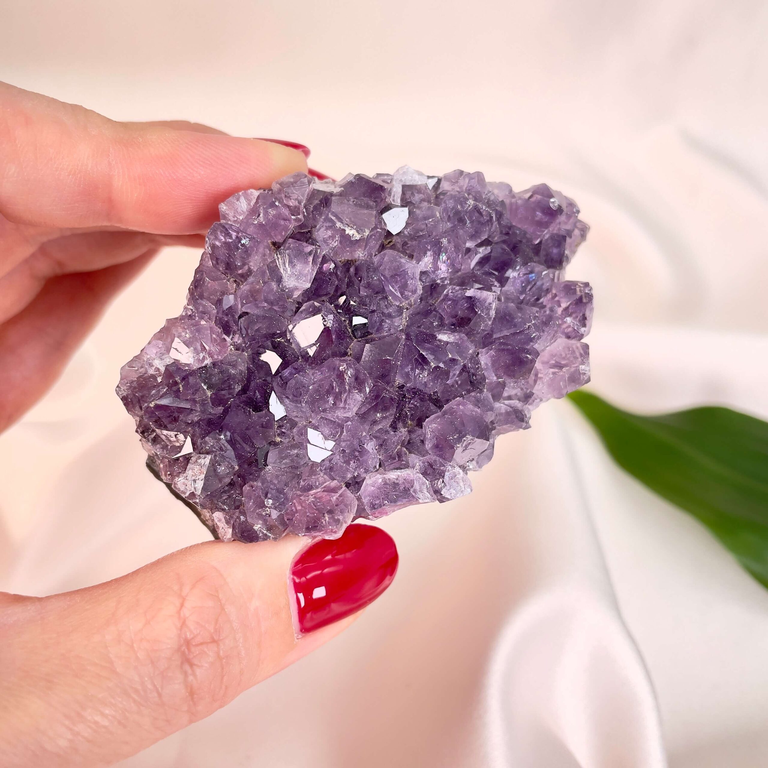 Energetisk balancerer Ametyst sindet og hjælper med at opnå en dybere selvindsigt. Den giver styrke til at slippe afhængigheder, gamle mønstre og destruktive tanker og den forbindes derfor både med spirituel vækst og praktisk livshjælp. Når livet føles kaotisk, giver en Ametyst klynge et fast holdepunkt og minder dig om, at ro findes indeni.