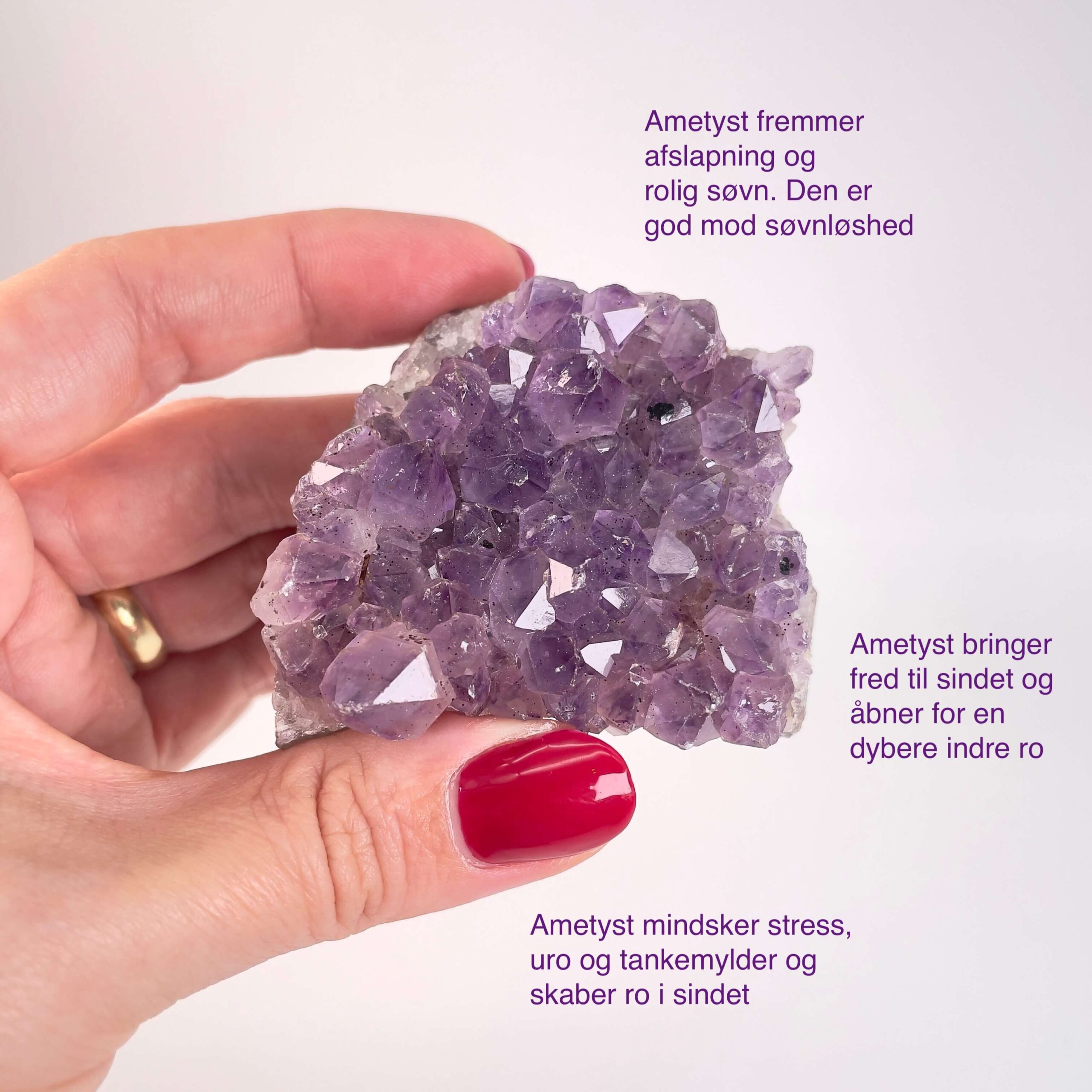 Ametyst giver Fisken ro i et sensitivt sind, hjælper Jomfruen med at slippe perfektionisme og finde fred og styrker skyttens intuition og livsmod.