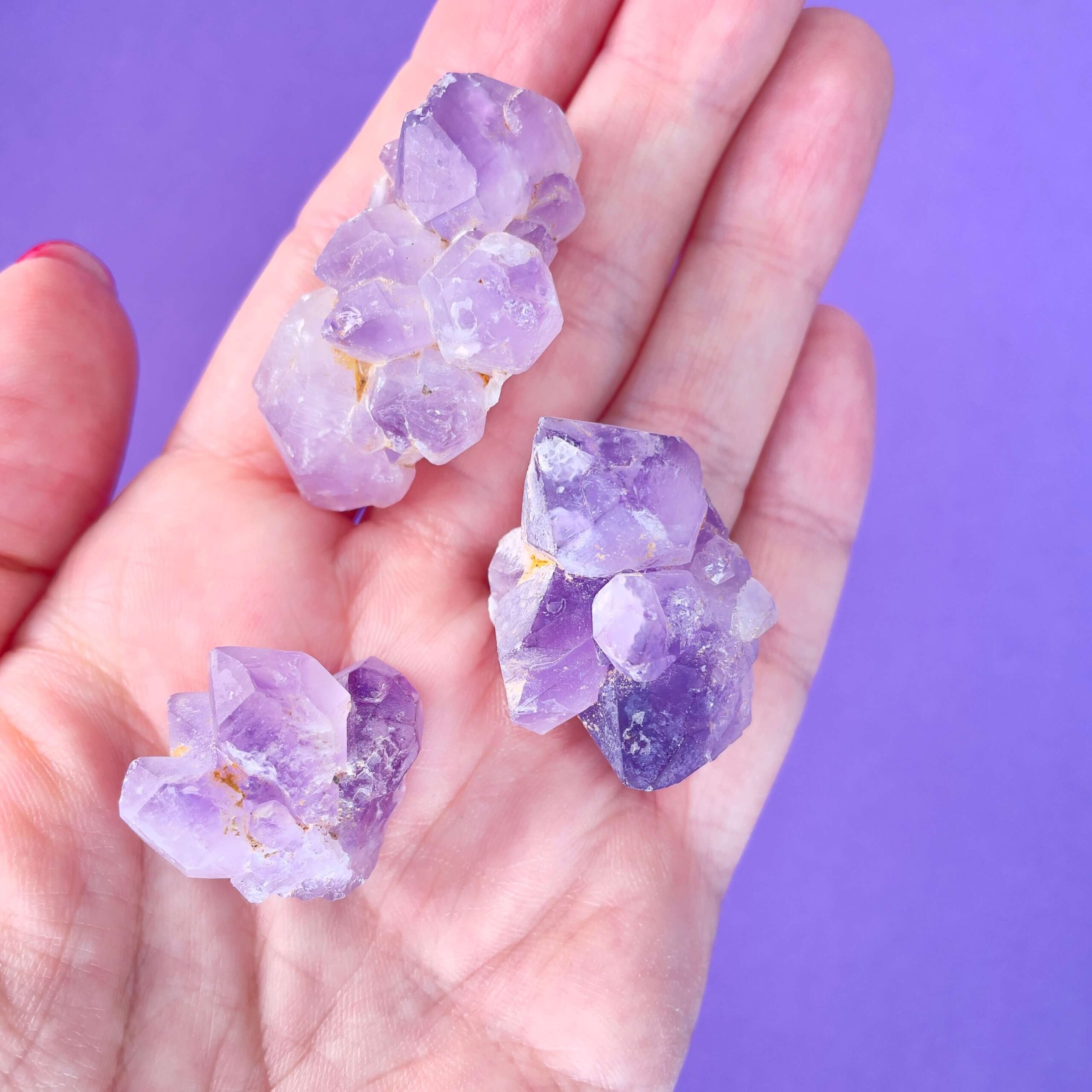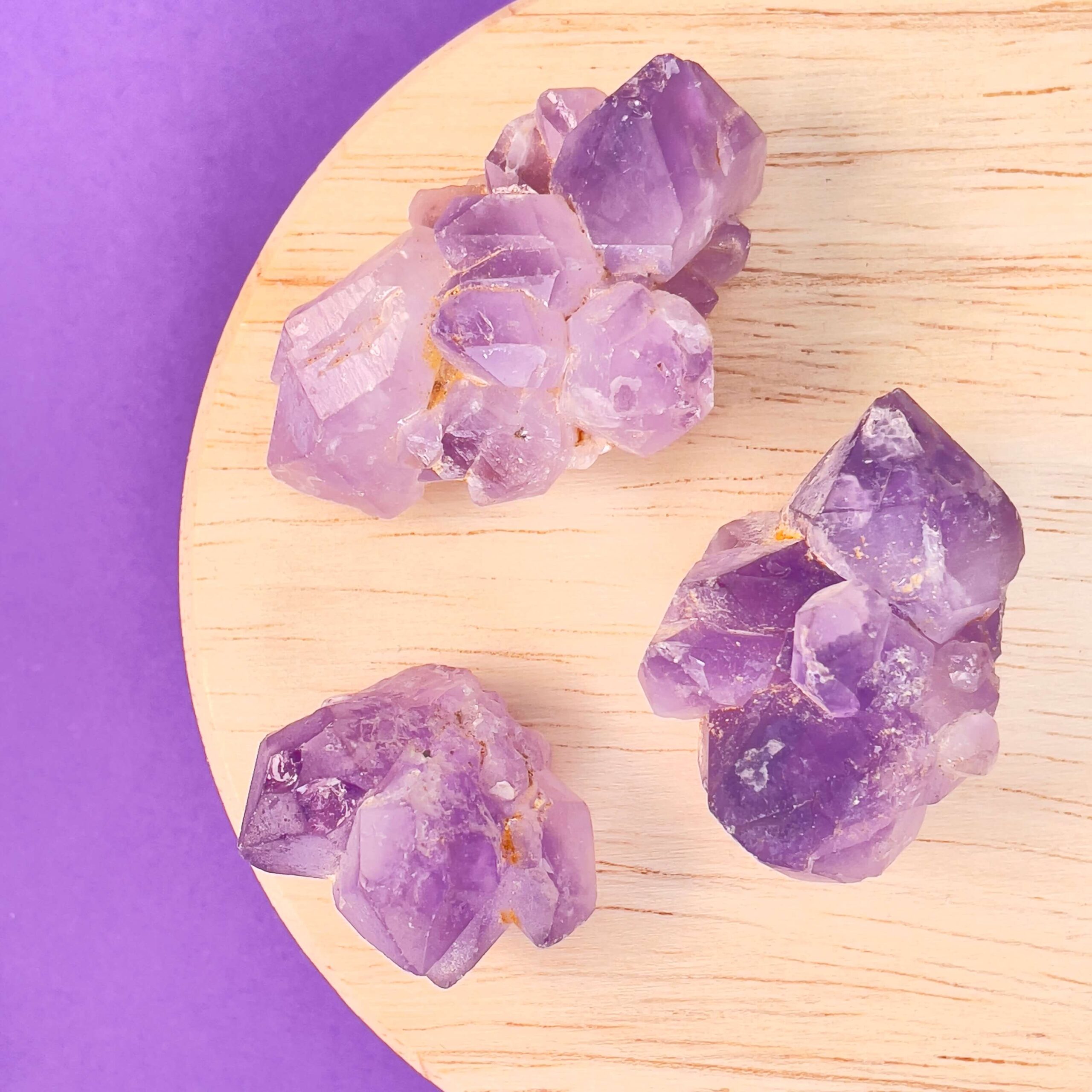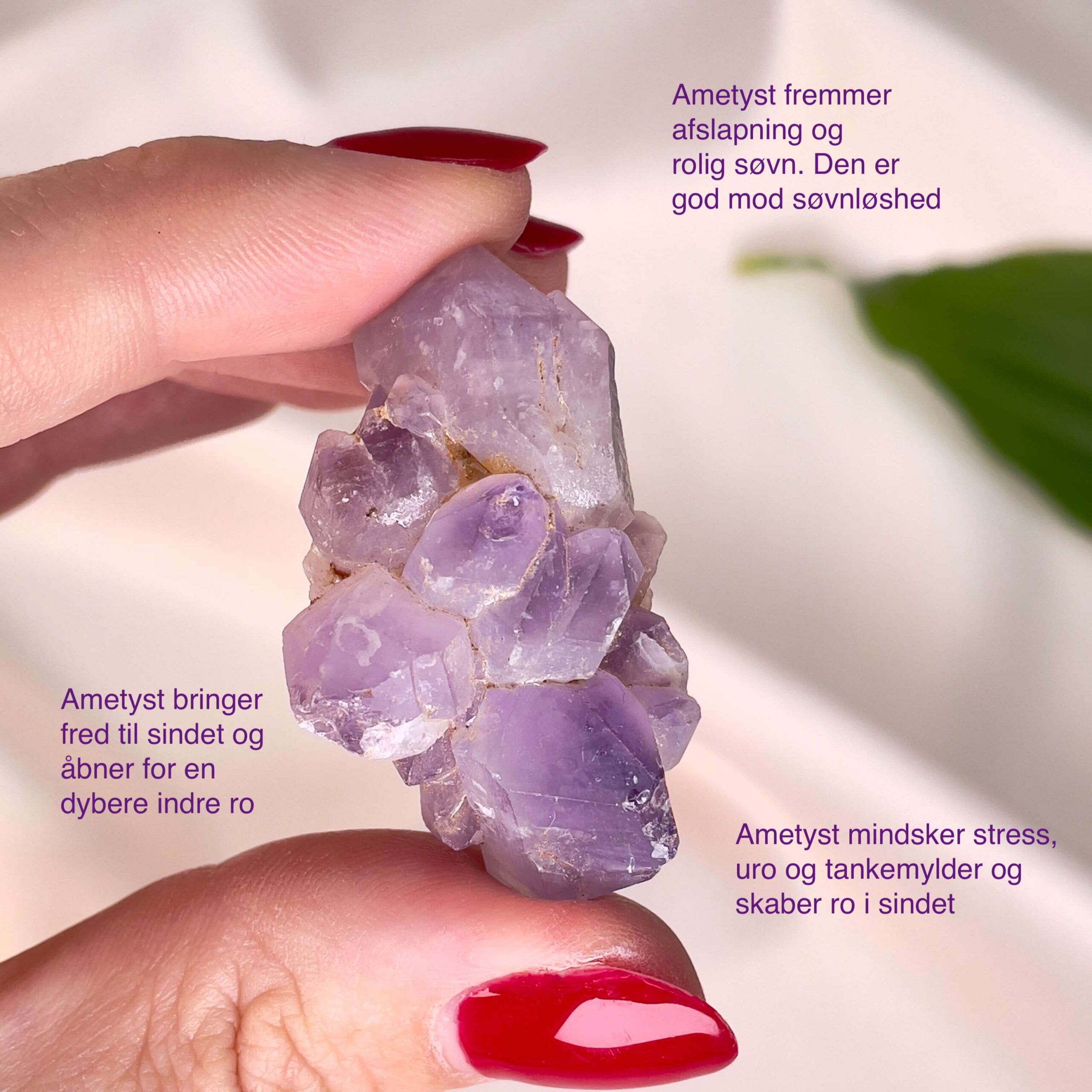 Energetisk balancerer Ametyst sindet og hjælper med at opnå en dybere selvindsigt. Den giver styrke til at slippe afhængigheder, gamle mønstre og destruktive tanker og den forbindes derfor både med spirituel vækst og praktisk livshjælp. Når livet føles kaotisk, giver en Ametyst klynge et fast holdepunkt og minder dig om, at ro findes indeni.