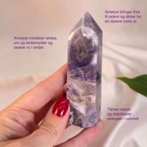 Energetisk balancerer Ametyst sindet og hjælper med at opnå en dybere selvindsigt. Den giver styrke til at slippe afhængigheder, gamle mønstre og destruktive tanker og den forbindes derfor både med spirituel vækst og praktisk livshjælp. Når livet føles kaotisk, giver Ametyst et fast holdepunkt og minder dig om, at ro findes indeni.