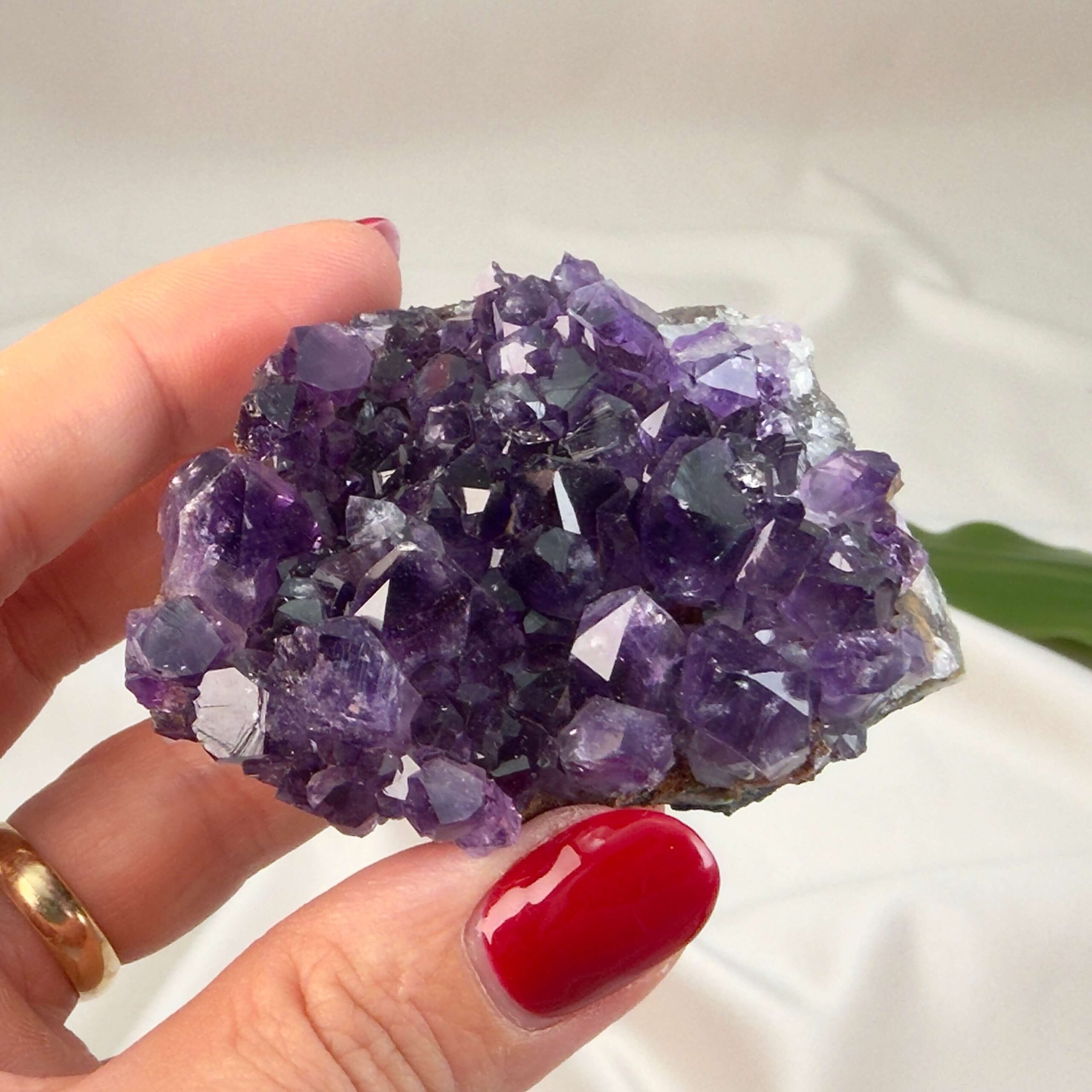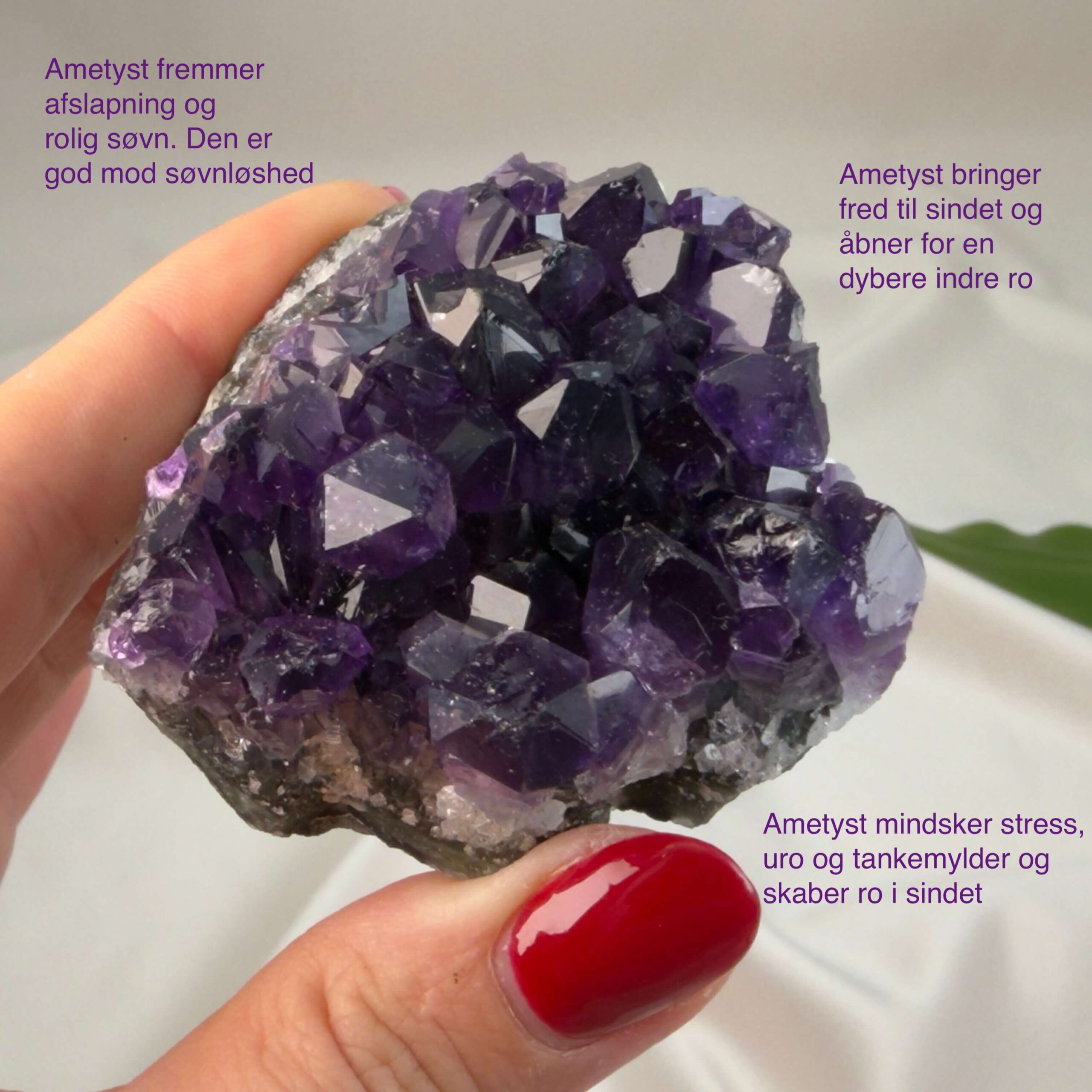Energetisk balancerer Ametyst sindet og hjælper med at opnå en dybere selvindsigt. Den giver styrke til at slippe afhængigheder, gamle mønstre og destruktive tanker og den forbindes derfor både med spirituel vækst og praktisk livshjælp. Når livet føles kaotisk, giver en Ametyst premium klynge et fast holdepunkt og minder dig om, at ro findes indeni.