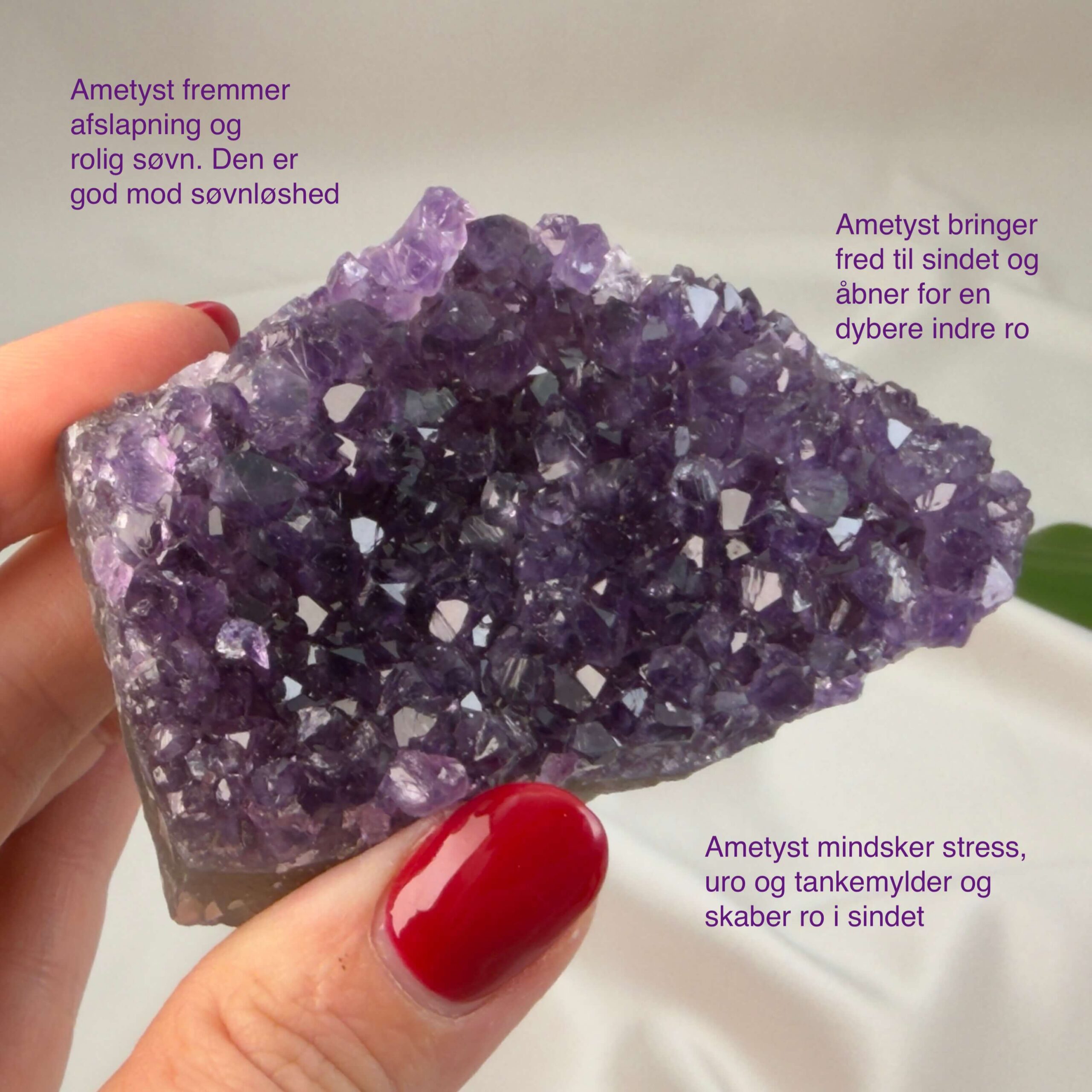 Ametyst er en af de mest ikoniske og elskede krystaller. En sten, der gennem årtusinder har været forbundet med åndelig klarhed, ro og beskyttelse. Med sine dybe violette nuancer udstråler den både mystik og harmoni. Ametyst er en af de vigtigste sten til meditation og spirituel udvikling. Den åbner forbindelsen til intuition, hjælper med at slippe negative mønstre og styrker evnen til at stole på din egen indre stemme. Den bliver også brugt af mange til at dæmpe stress, uro og søvnbesvær, og den kaldes ofte for “anti-stress-stenen”.