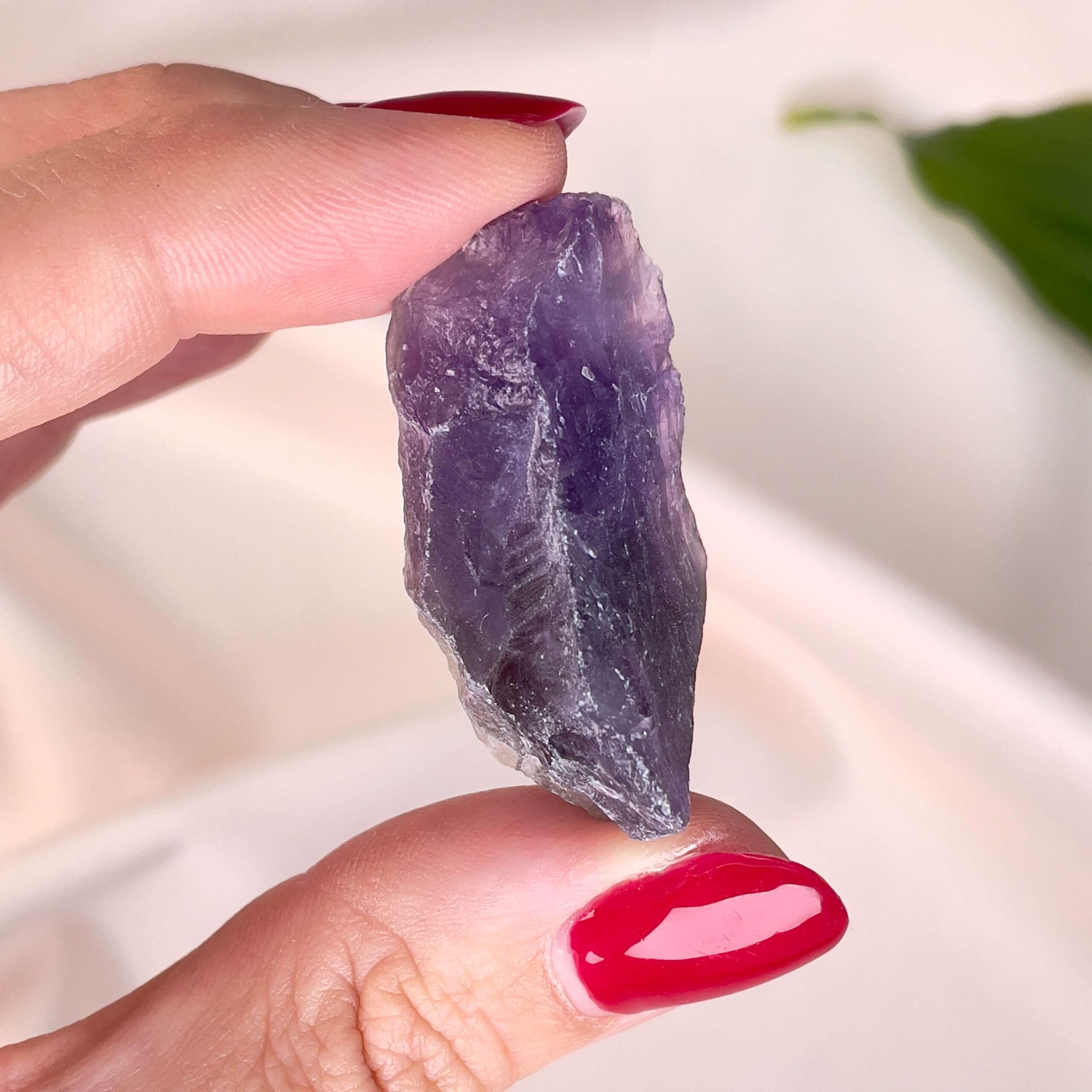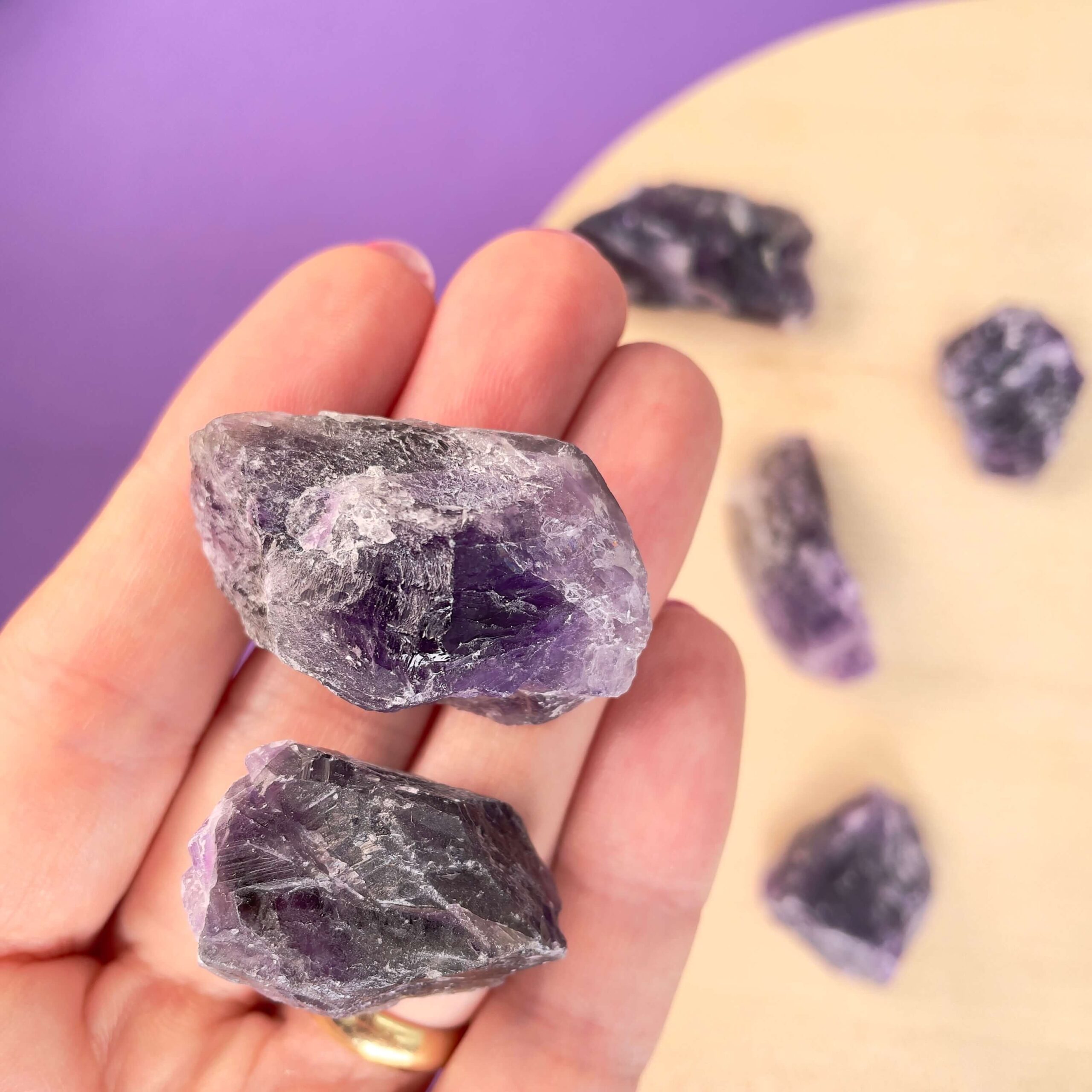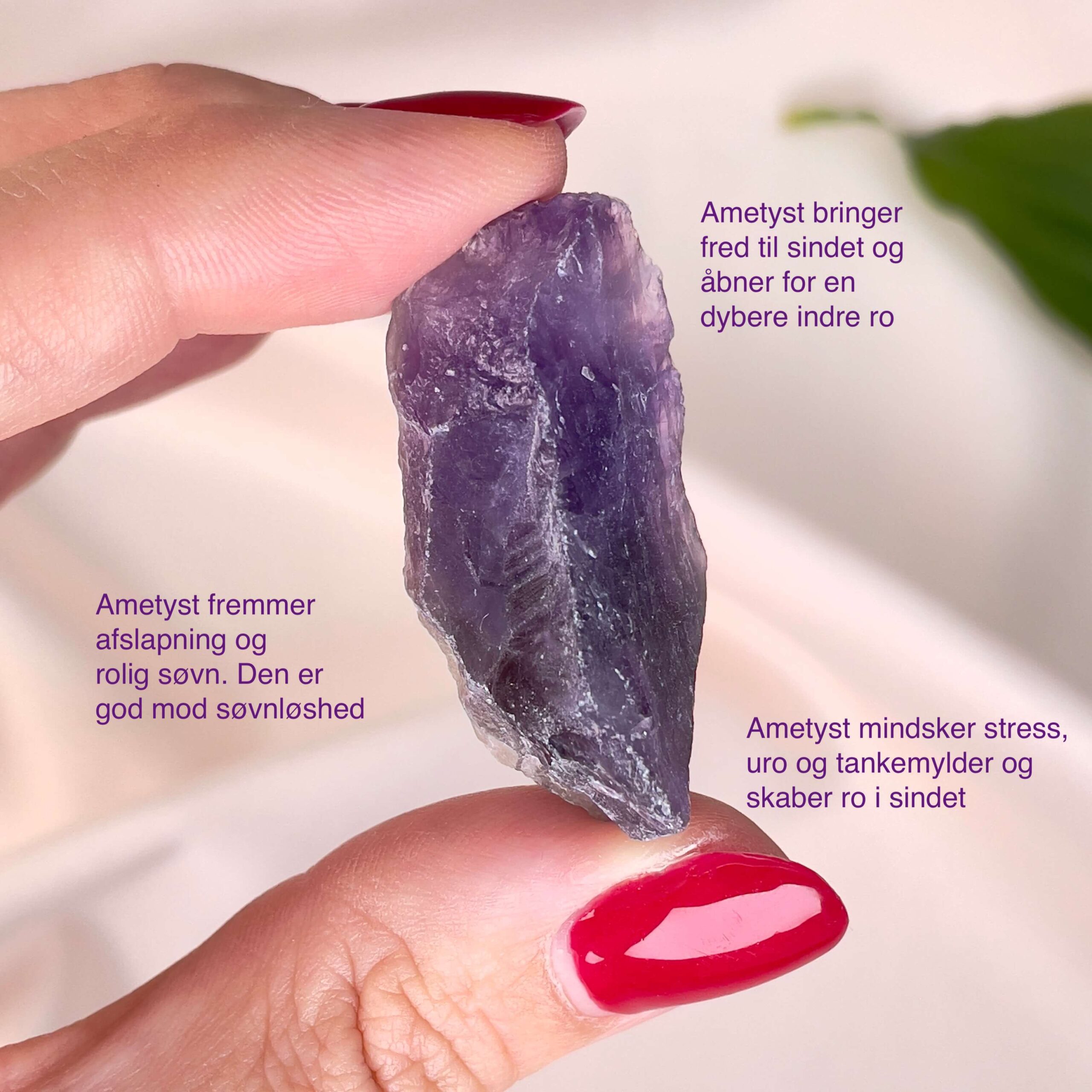 Energetisk balancerer Ametyst sindet og hjælper med at opnå en dybere selvindsigt. Den giver styrke til at slippe afhængigheder, gamle mønstre og destruktive tanker og den forbindes derfor både med spirituel vækst og praktisk livshjælp. Når livet føles kaotisk, giver en Ametyst rå sten et fast holdepunkt og minder dig om, at ro findes indeni.