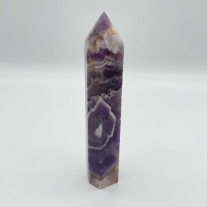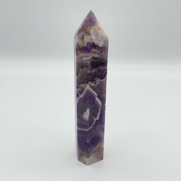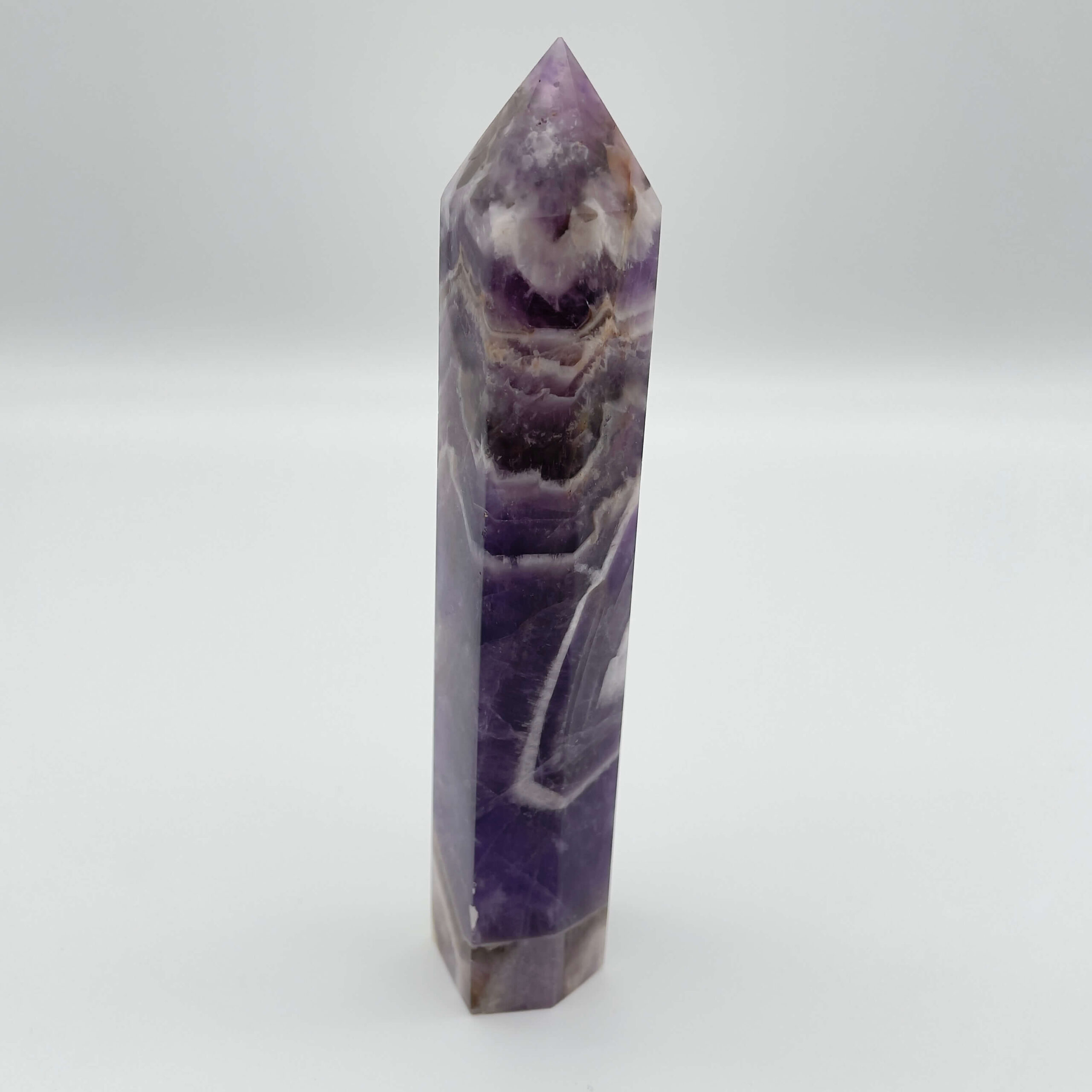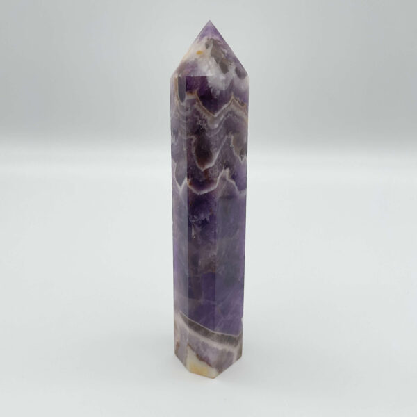 Denne Ametyst er udformet som et tårn. Det specielle ved netop denne form er, at den spidse top leder energien opad eller ud i det rum, hvor den står. Den er god at placere i hjemmet eller på et alter for at rense og stabilisere energien i rummet.
