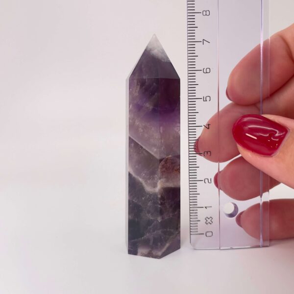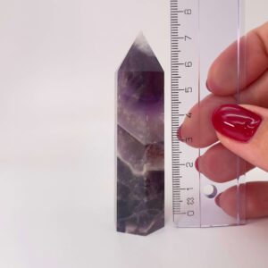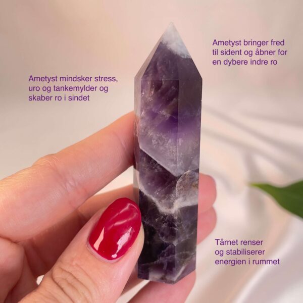 Denne Ametyst er udformet som et tårn. Det specielle ved netop denne form er, at den spidse top leder energien opad eller ud i det rum, hvor den står. Den er god at placere i hjemmet eller på et alter for at rense og stabilisere energien i rummet.