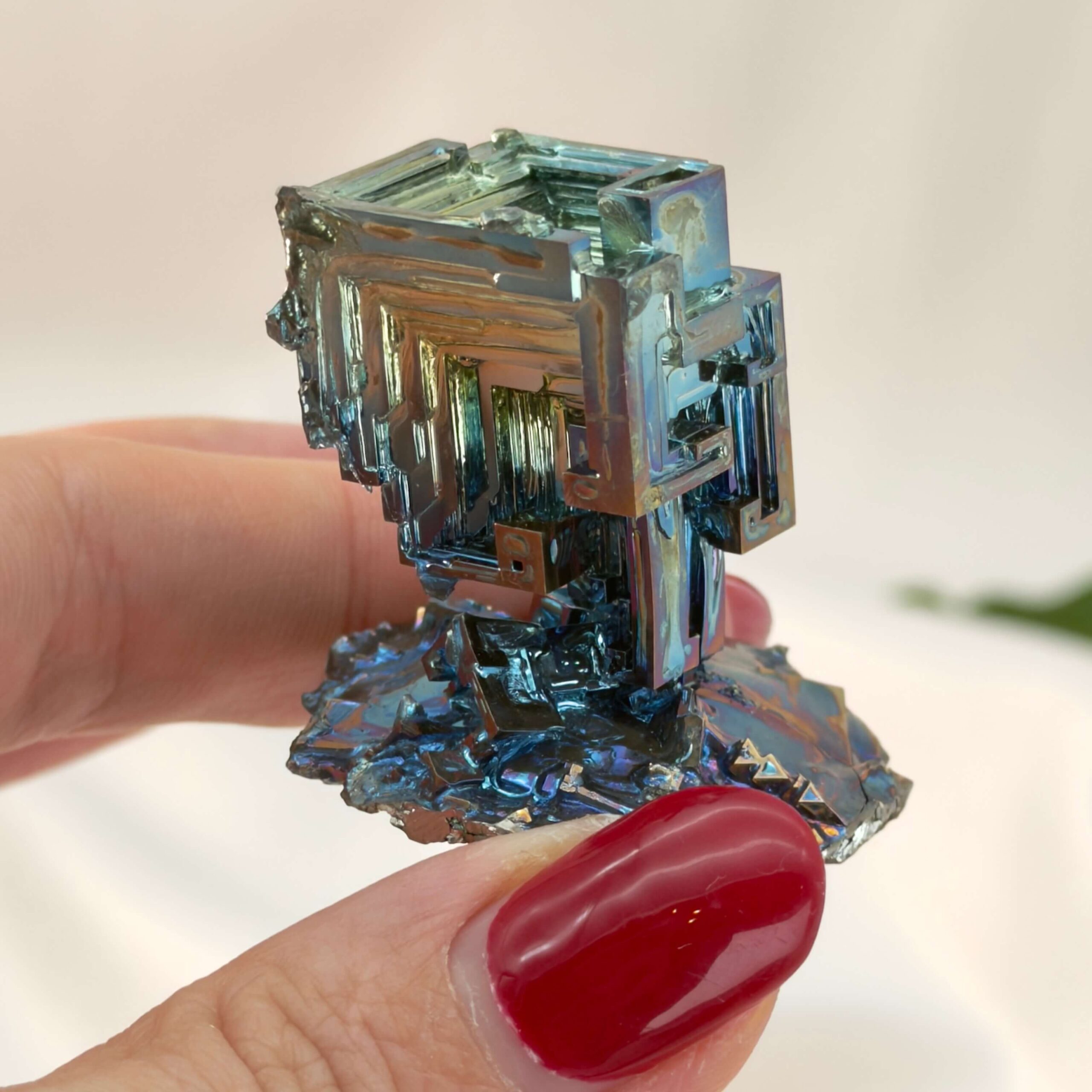 Bismut er en af de mest unikke krystaller, du kan arbejde med. Dens rå form viser stærke, geometriske mønstre, som danner små trappe-lignende strukturer. Farverne skifter mellem pink, guld, blå og grøn i et metallisk skær, der fanger lyset og skaber en næsten regnbueagtig glød. Energiudtrykket fra bismut føles levende, fornyende og stærkt, men samtidig roligt og forankrende. Den støtter både mental klarhed og følelsesmæssig styrke.