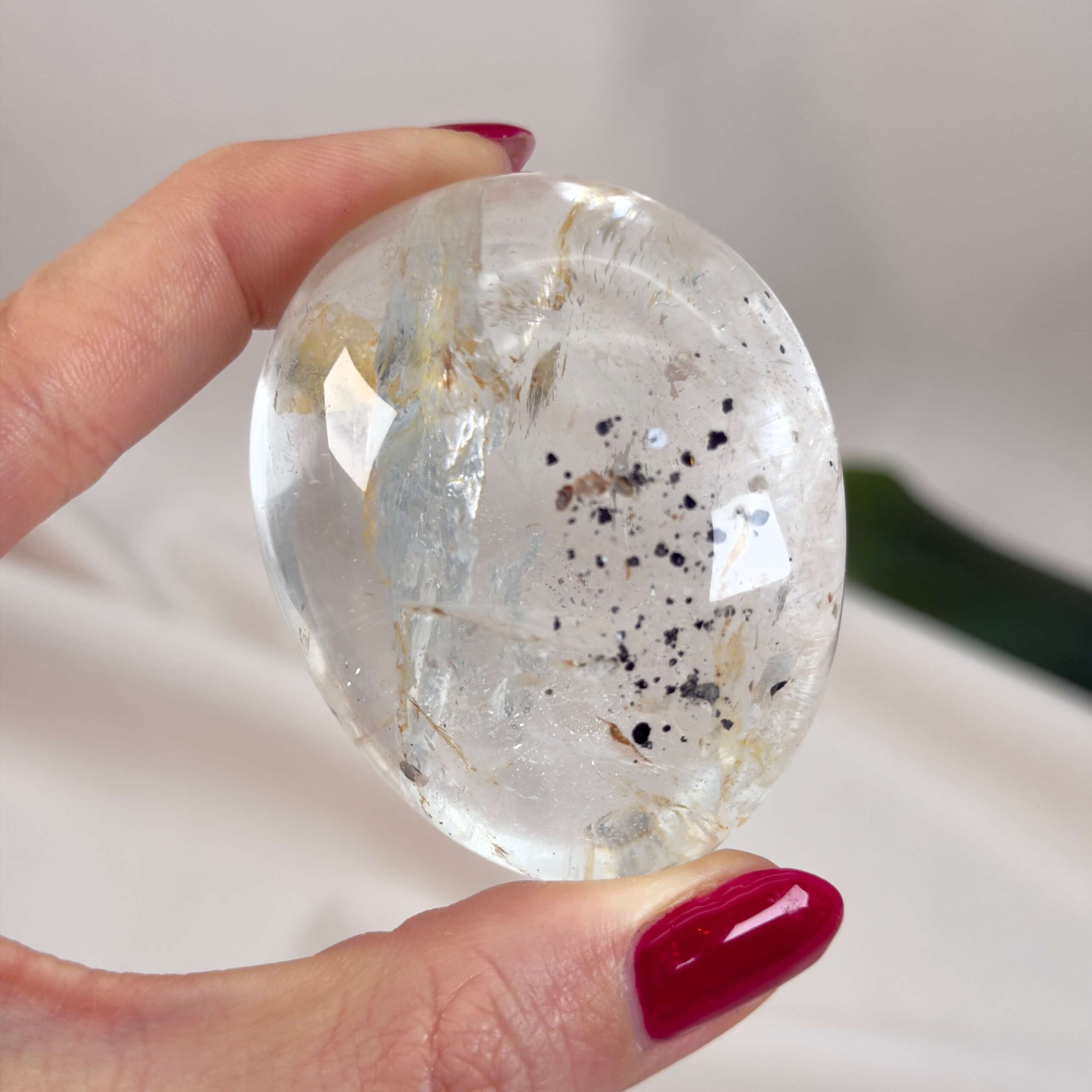 En Bjergkrystal håndsten er skabt til ro, nærvær og kontakt. De er flade, ovale og runde sten, som er slebet og poleret og ligger perfekt i håndfladen. Formen gør dem behagelige at holde på, hvilket netop er kernen i deres energi, nemlig fysisk kontakt, grounding og ro.