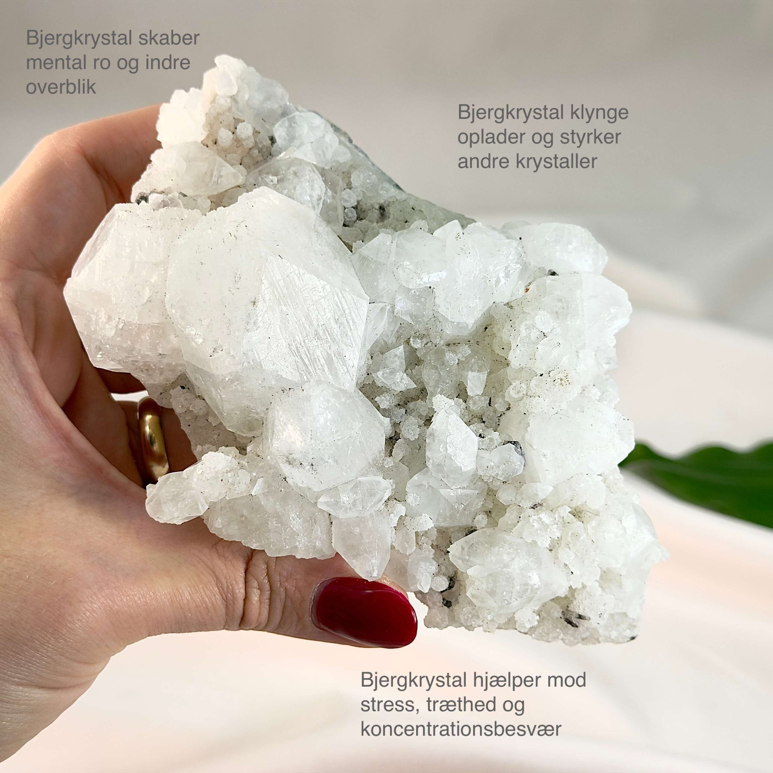 Bjergkrystal er den mest rene og klare form for kvarts. Den symboliserer lys, klarhed og balance og siges at være mesterhealeren blandt krystaller. Dens energi er både kraftfuld og harmonisk, hvilket gør den til en af de mest alsidige sten i krystal verdenen.