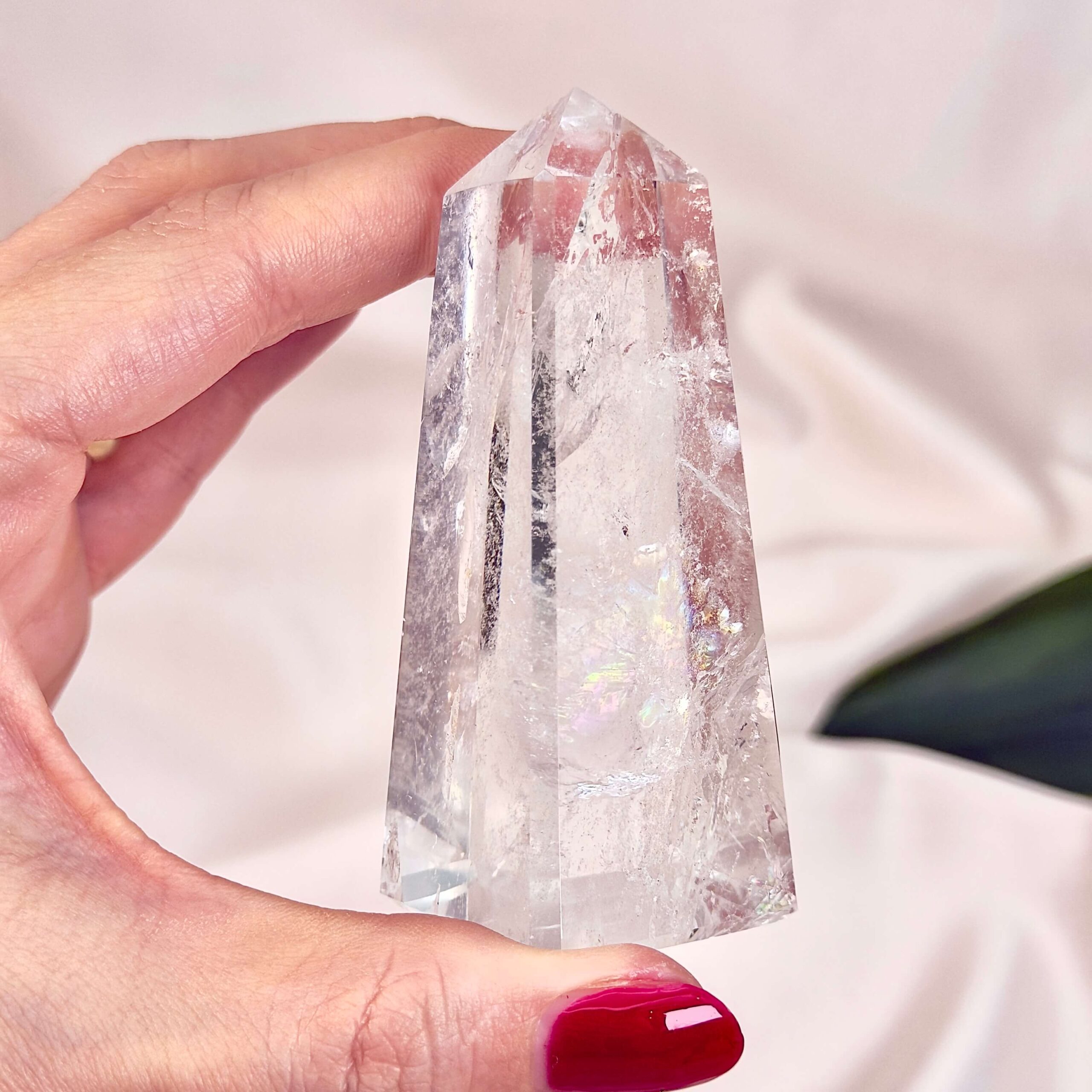 Denne Bjergkrystal er udformet som et tårn. Det specielle ved netop denne form er, at den spidse top leder energien opad eller ud i det rum, hvor den står. Den er god at placere i hjemmet eller på et alter for at rense og stabilisere energien i rummet.