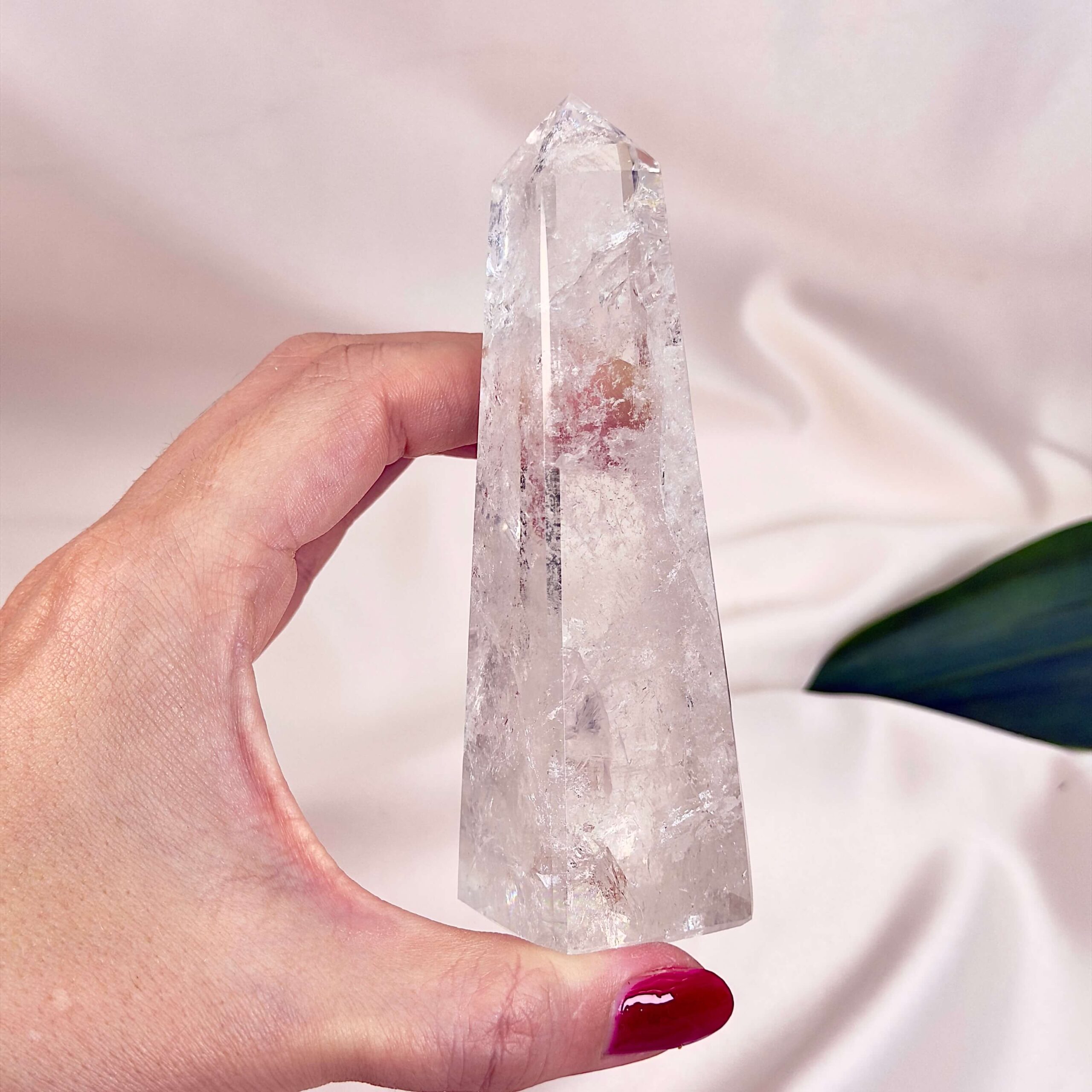 Denne Bjergkrystal er udformet som et tårn. Det specielle ved netop denne form er, at den spidse top leder energien opad eller ud i det rum, hvor den står. Den er god at placere i hjemmet eller på et alter for at rense og stabilisere energien i rummet.