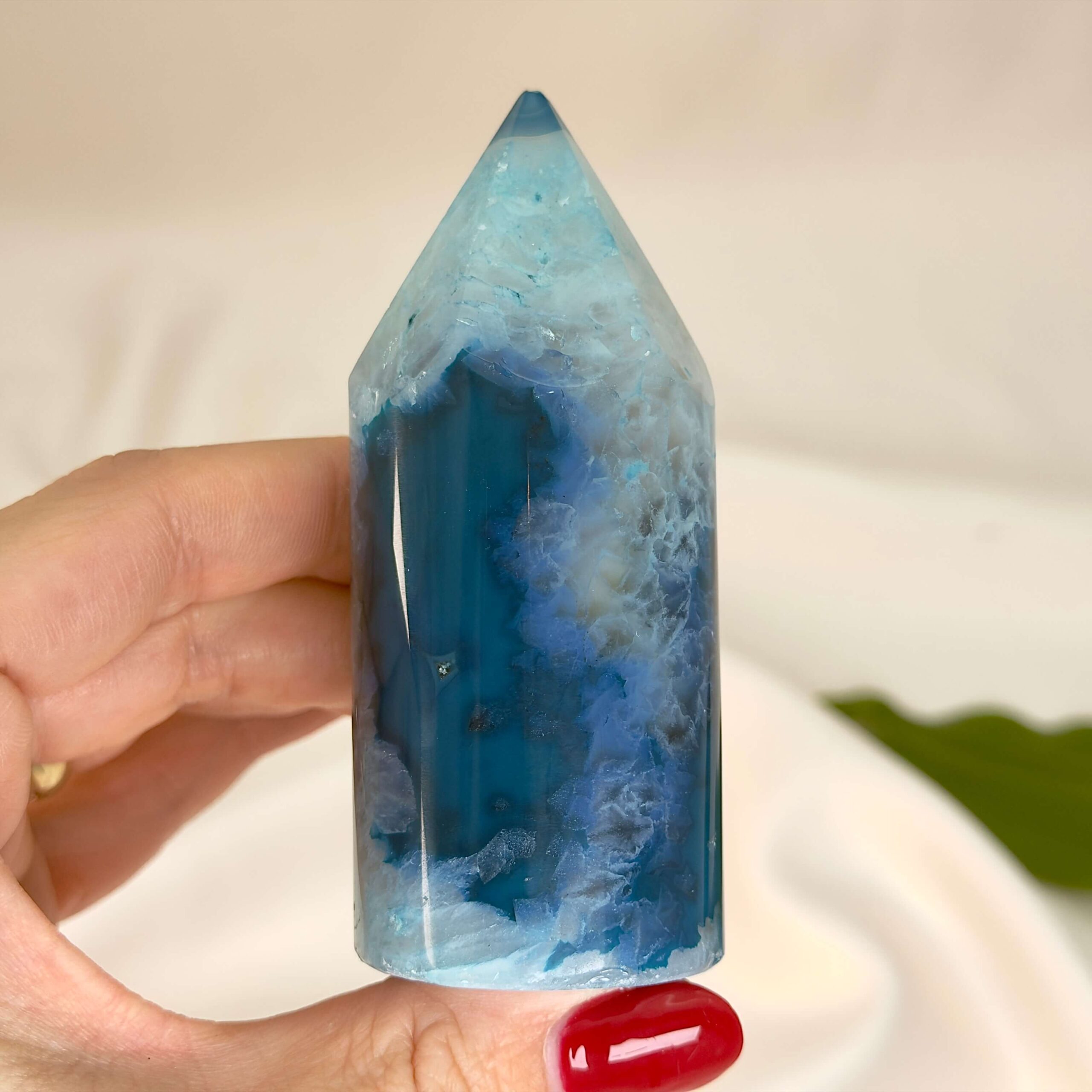Denne Blå Agat spids er i kategorien one-of-a-kind, hvilket betyder, at det er krystallen på billedet du køber. Prisen er for denne éne krystal. Spidsen måler 9 cm i højden og vejer 192g.