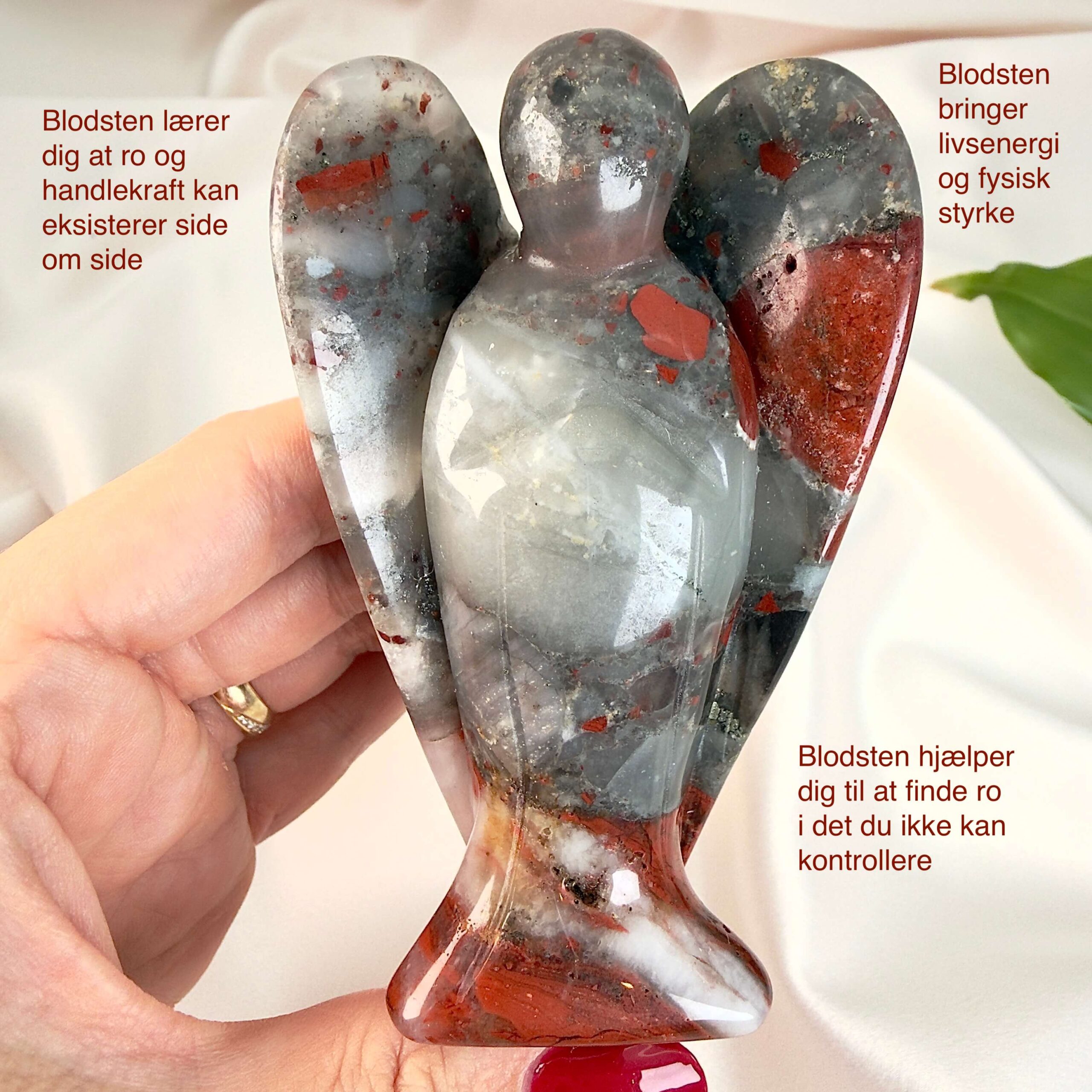 Blodsten, også kendt som Heliotrop, er en kraftfuld og jordnær sten, der forbindes med mod, handlekraft og livsenergi. En Blodsten engel bærer jordens dybeste styrke og minder os om, at ro og handlekraft kan eksistere side om side. Energetisk virker Blodsten som et anker. Den hjælper med at stå fast i udfordrende perioder og støtter dig i at handle ud fra styrke i stedet for frygt. Den opbygger mod, beslutsomhed og vilje, og hjælper dig med at finde ro i det, du ikke kan kontrollere.