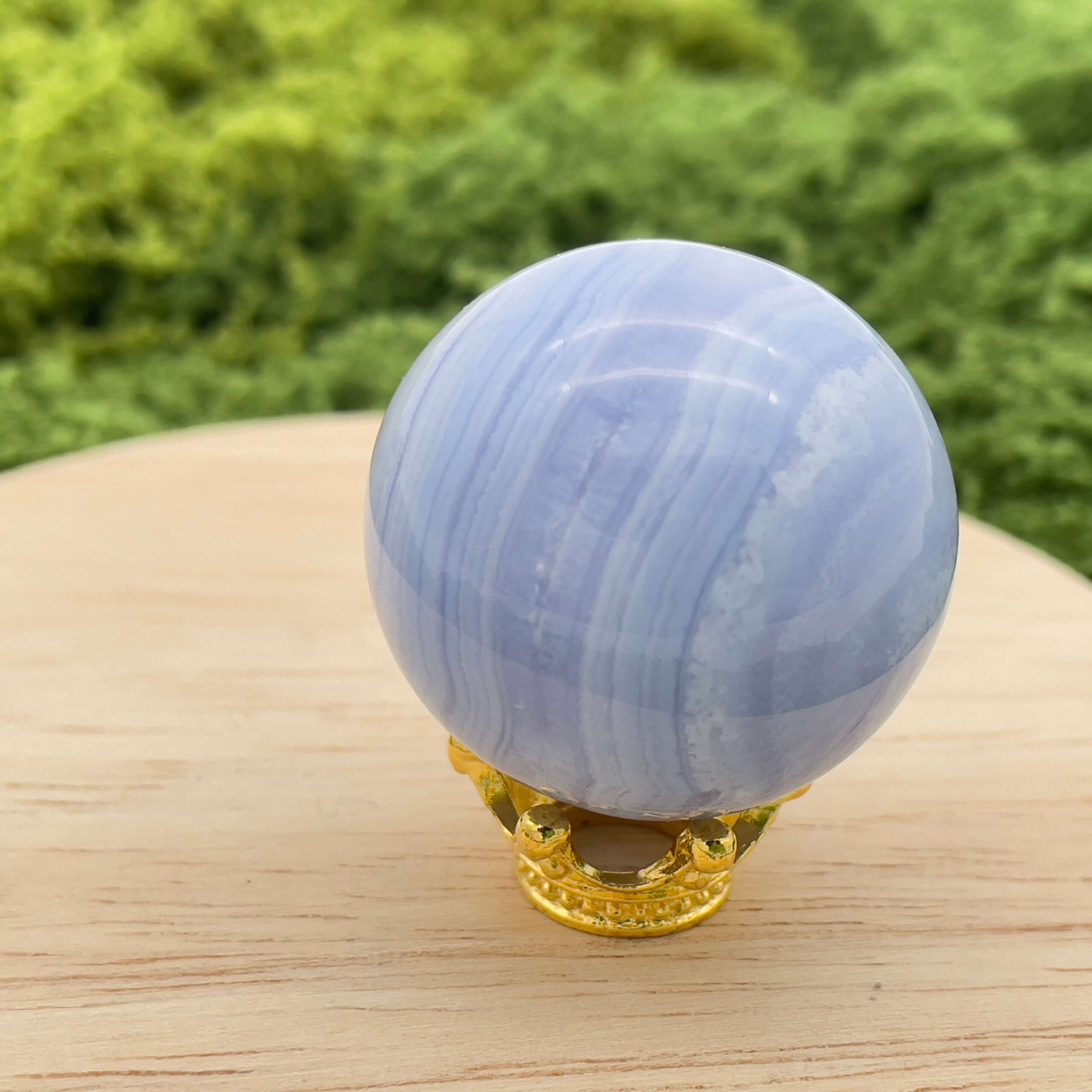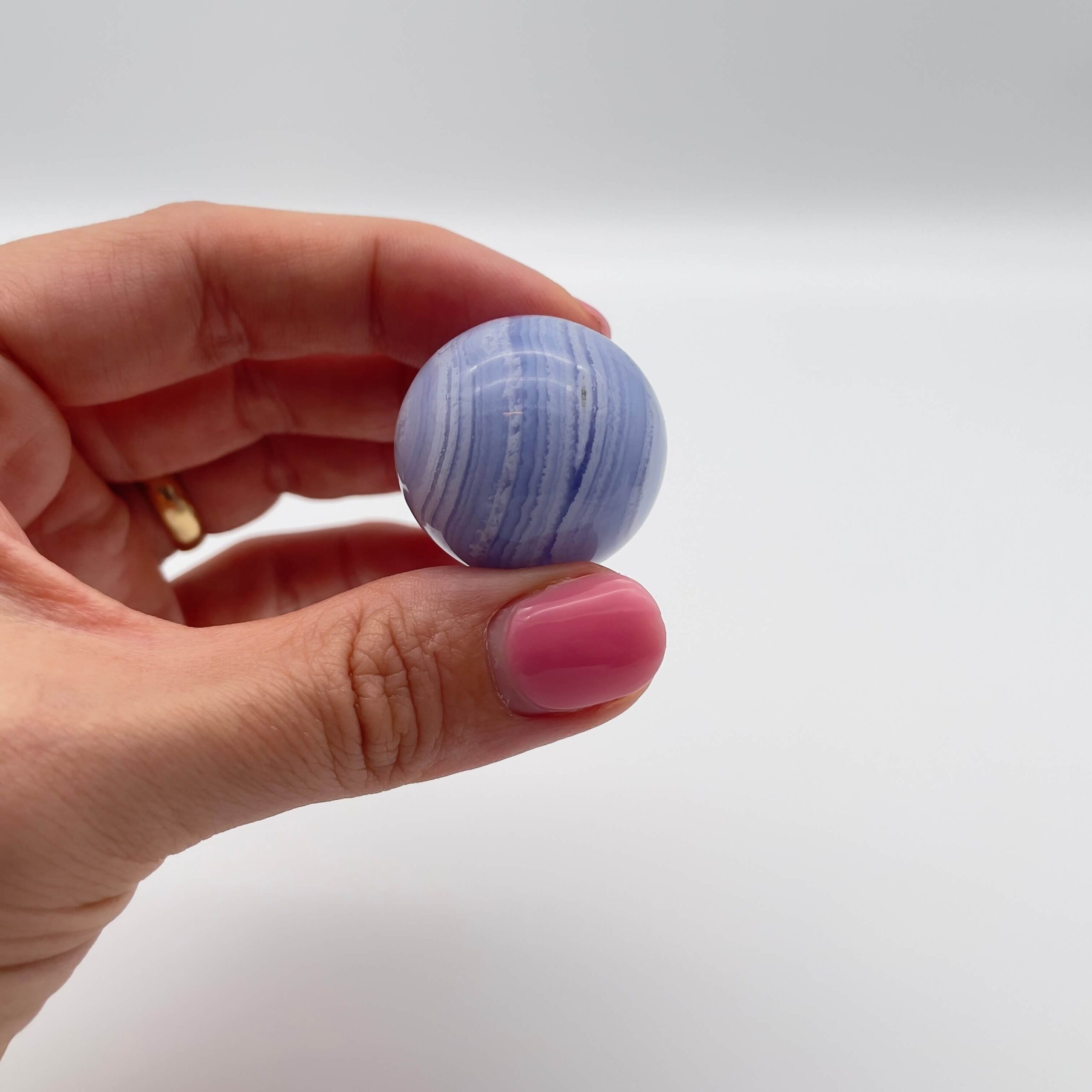 Denne fine blondeagat er en af de mest beroligende og harmoniske krystaller. Den er højt elsket af mange mennesker for sin energi og smukke udseende. Dens lyseblå og hvide bånd danner mønstre, der mest af alt minder om himlens smukke skyer en varm sommerdag eller havets rolige bølger. Denne visuelle blidhed afspejles i dens kølende, afstressende og balancerende energi.