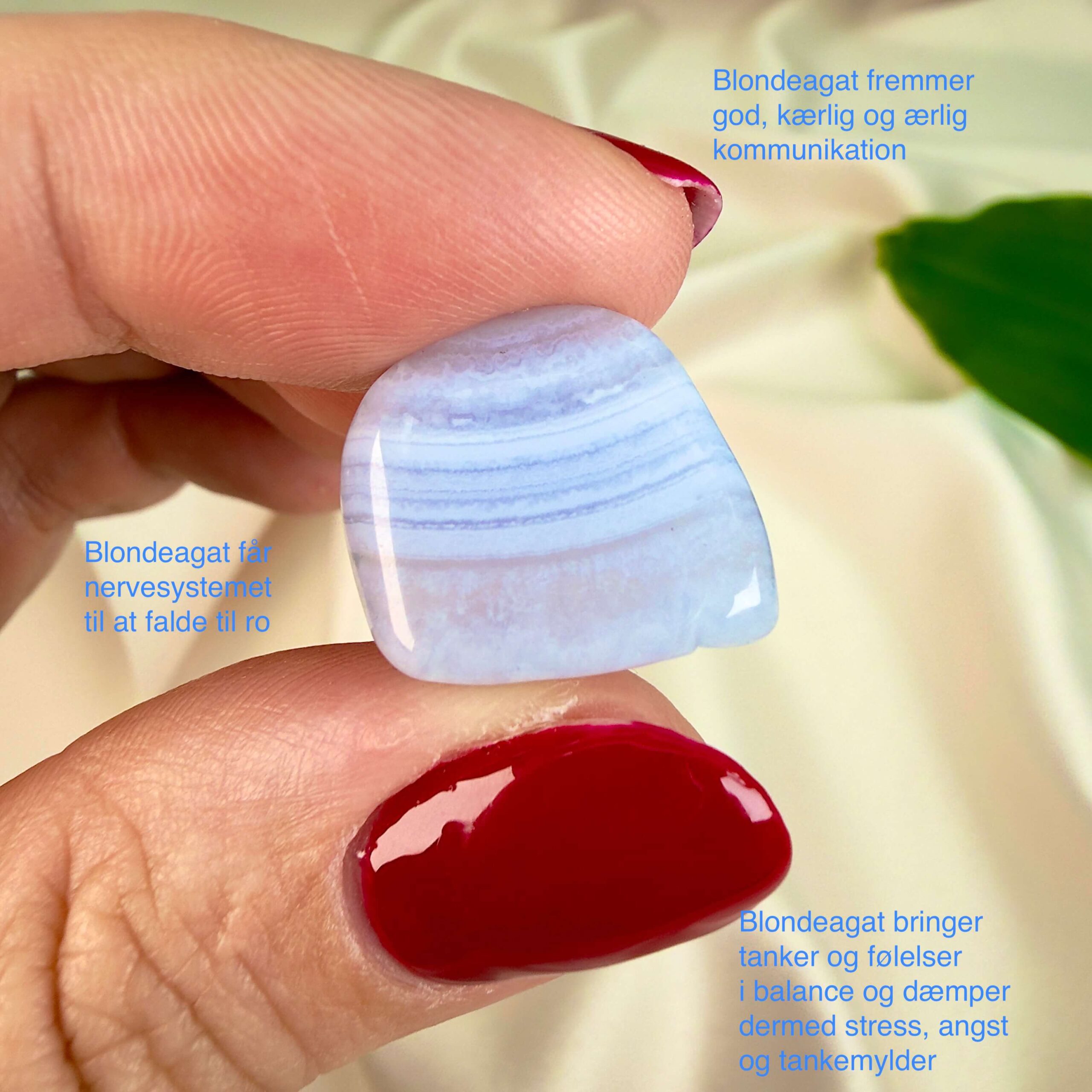 Blondeagat er en speciel type agat med fine lyseblå og hvide bånd. Agaten dannes i hulrum i vulkanske bjergarter. De mineraler, der i forskellige lag har dannet sig, udgør stenes udseende. Når stenen tromles og poleres, bliver skarpe kanter slebet af og båndene kan åbne sig, og dette vil give forskellige udtryk i de forskellige udformninger, afhængig af, hvordan råstykket er skåret, også selvom de kommer fra samme brud.