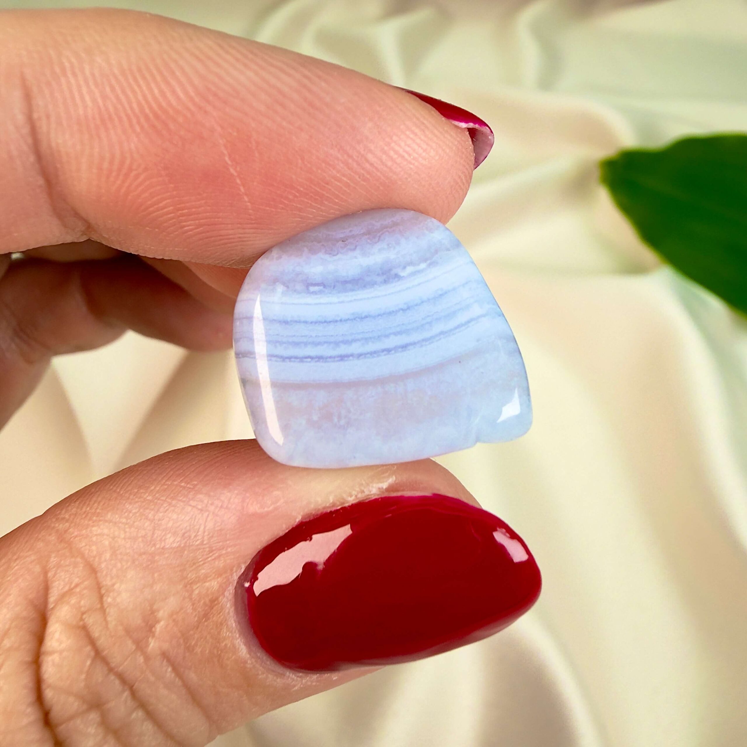 Denne fine blondeagat er en af de mest beroligende og harmoniske krystaller. Den er højt elsket af mange mennesker for sin energi og smukke udseende. Dens lyseblå og hvide bånd danner mønstre, der mest af alt minder om himlens smukke skyer en varm sommerdag eller havets rolige bølger. Denne visuelle blidhed afspejles i dens kølende, afstressende og balancerende energi.