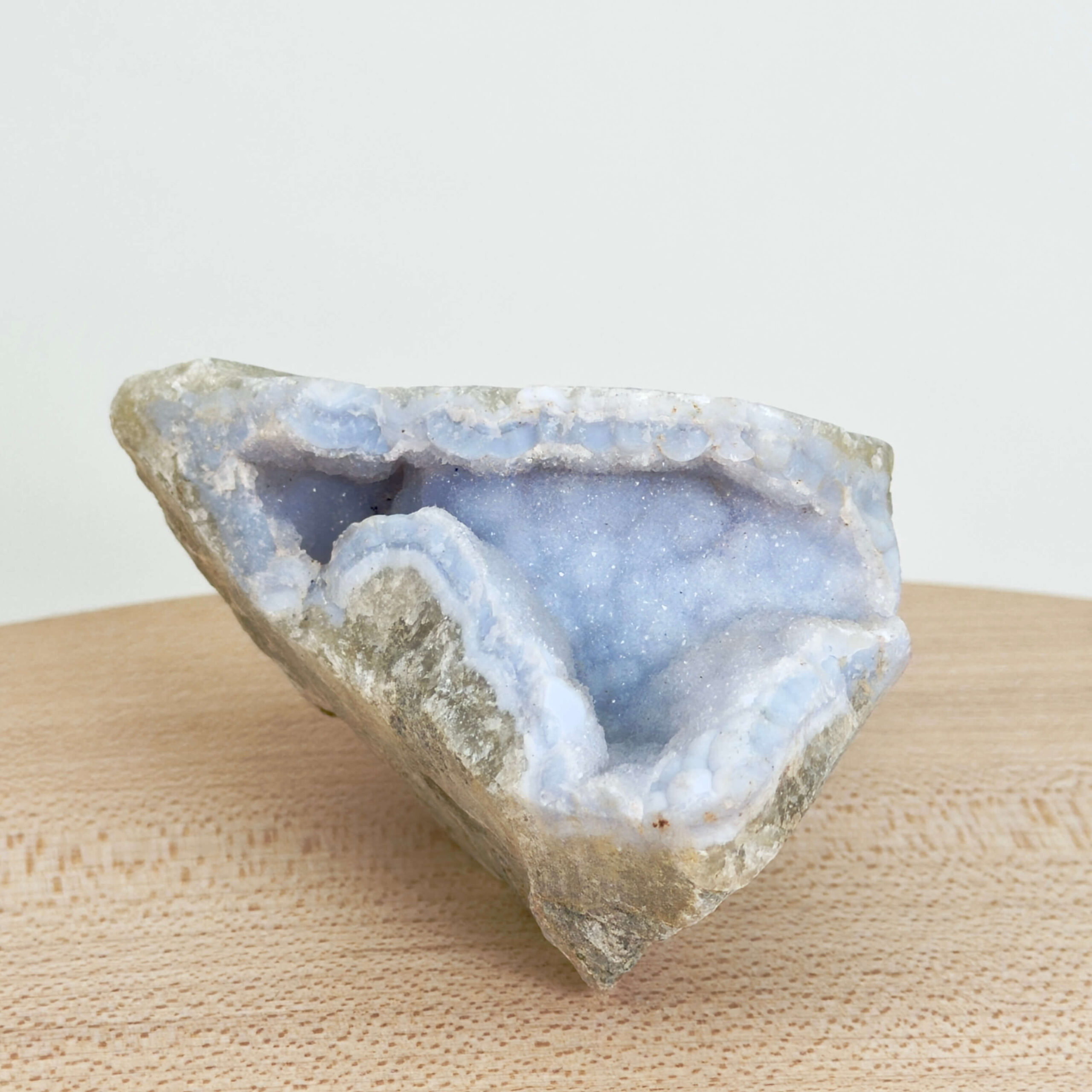 Blondeagat Rå er en smuk blå krystal, der er kendt for sine fine bånd af lys blå og hvid. Stenen kaldes ofte også Blue Lace Agate, og dens rolige farver har gjort den til en af de mest populære blå krystaller i moderne krystalbrug. Når man taler om blondeagat betydning, forbindes stenen især med ro, klarhed og harmonisk kommunikation.