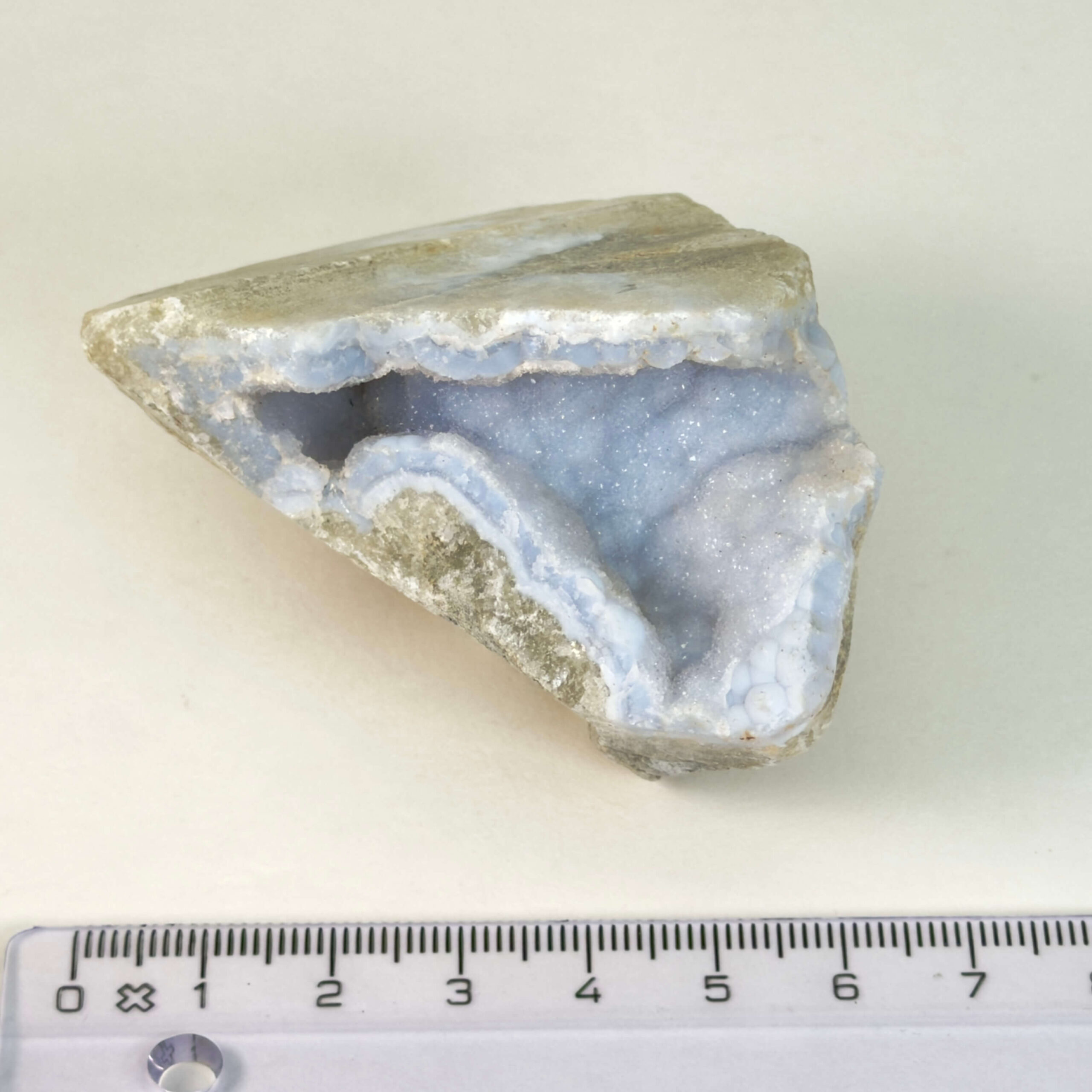 Blondeagat dannes i hulrum i vulkanske bjergarter, hvor silica langsomt aflejres i tynde lag gennem lange geologiske perioder. Disse lag skaber de karakteristiske bånd, som giver stenen sit blondeagtige udtryk. Farverne spænder typisk fra lys blå og gråblå til hvidlige nuancer, og de fine lag gør hver sten helt unik.