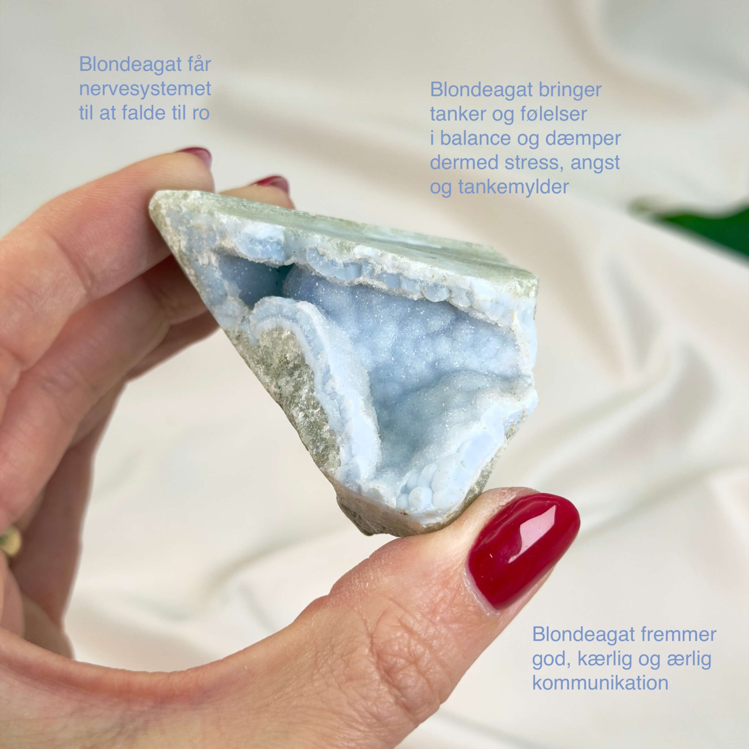 – Blondeagat bruges ofte til at skabe mental ro, klarhed og bedre kommunikation. Krystallen forbindes især med halschakra og hjælper med at udtrykke tanker og følelser klart.