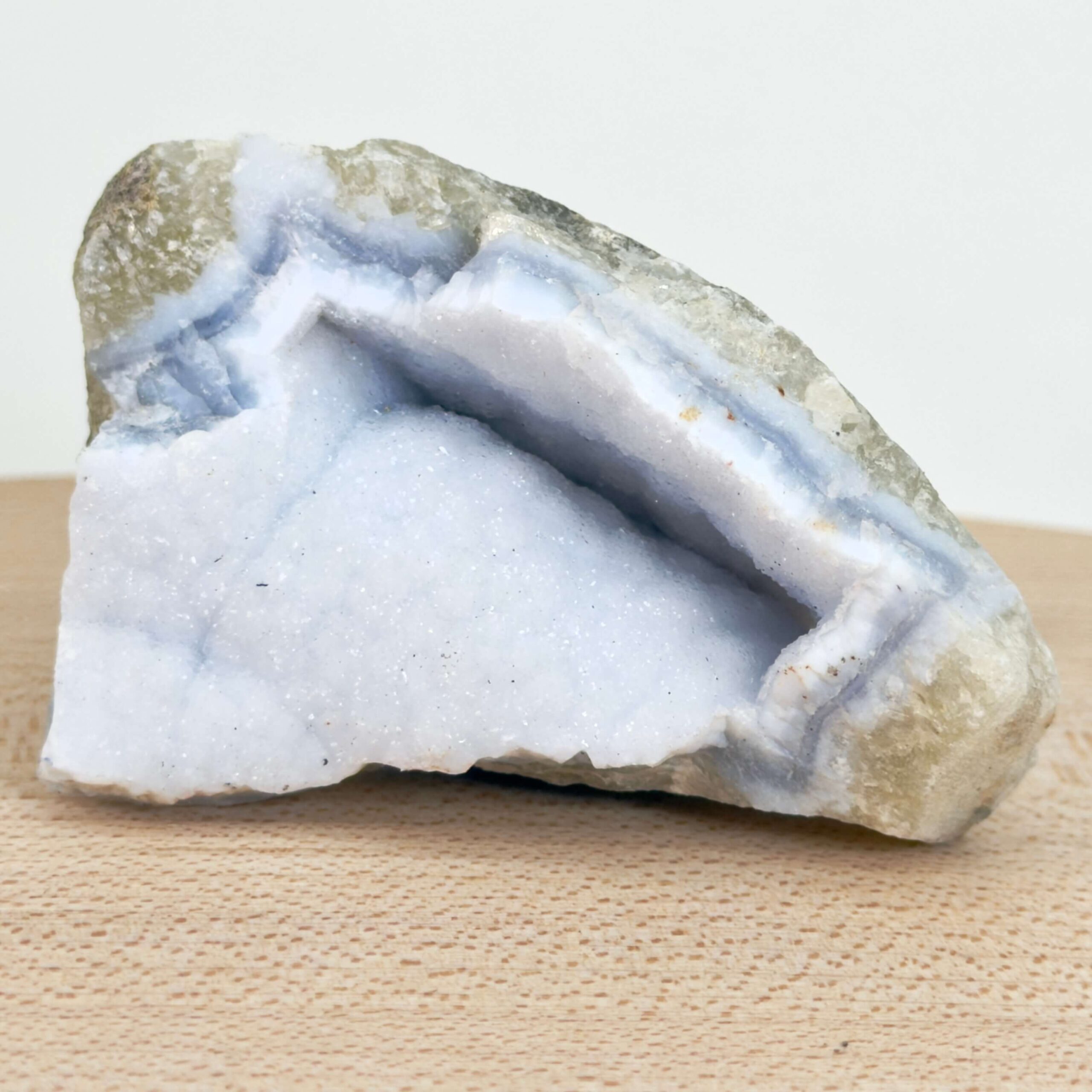 Blondeagat rå fremhæver krystallens naturlige skønhed uden nogen form for forarbejdning. Overfladen kan være både mat, ujævn og let krystallinsk, hvilket giver stenen et spændende udtryk. De blå nuancer varierer fra sten til sten, og lagene kan være både tydelige og mere diskrete. Det gør hver rå Blondeagat helt unik.