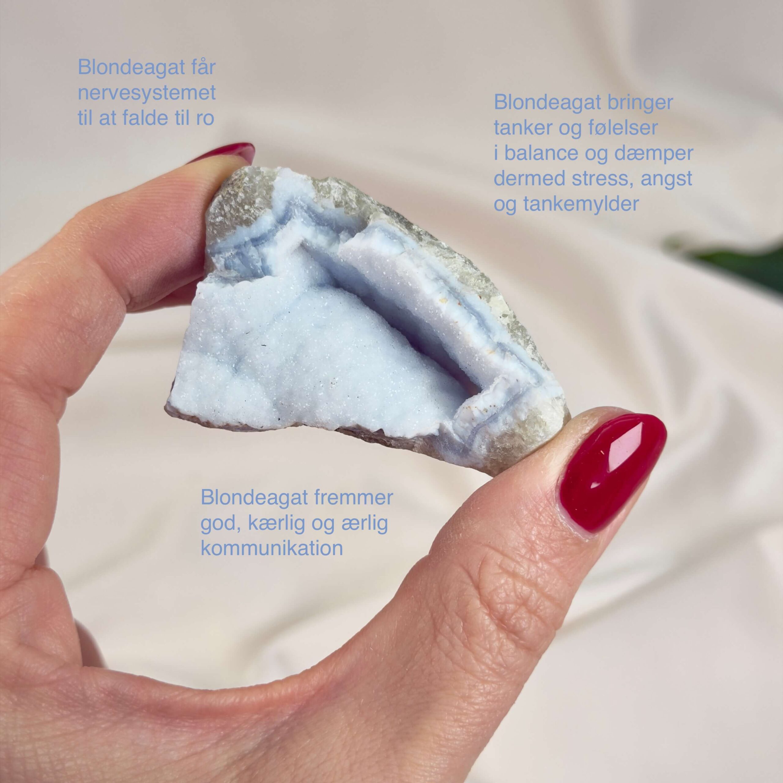 Energetisk forbindes rå blondeagat ofte med grounding og stabilitet. Den naturlige form kan give en følelse af ro og tyngde, som hjælper kroppen og sindet med at falde til ro. Rå krystaller bruges derfor ofte i meditation, energiarbejde eller som en rolig og harmonisk tilføjelse til hjemmet. Blondeagat i rå form kan også være en smuk påmindelse om naturens egne processer, hvor tid, pres og mineraler langsomt har skabt den sten, du nu holder i hånden.
