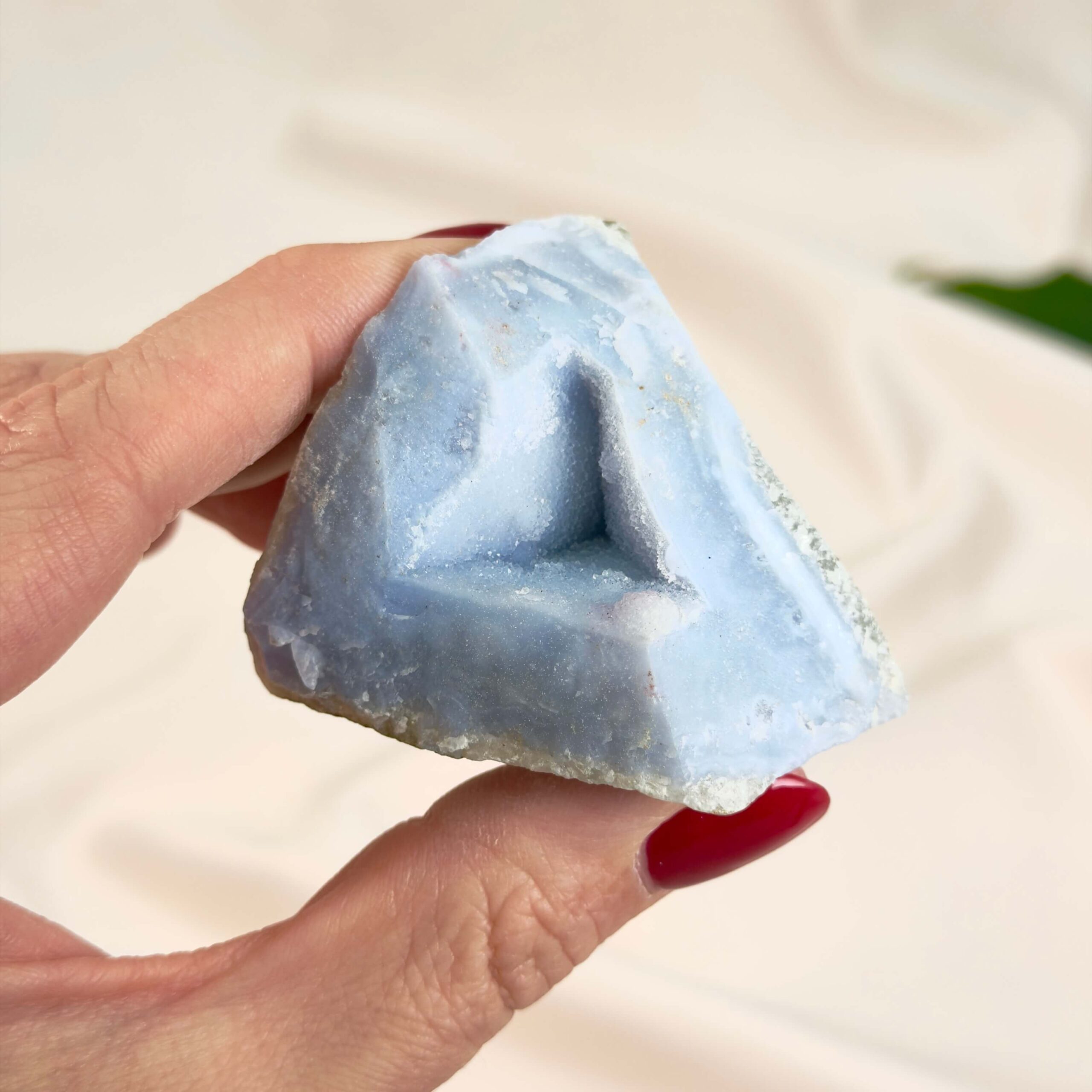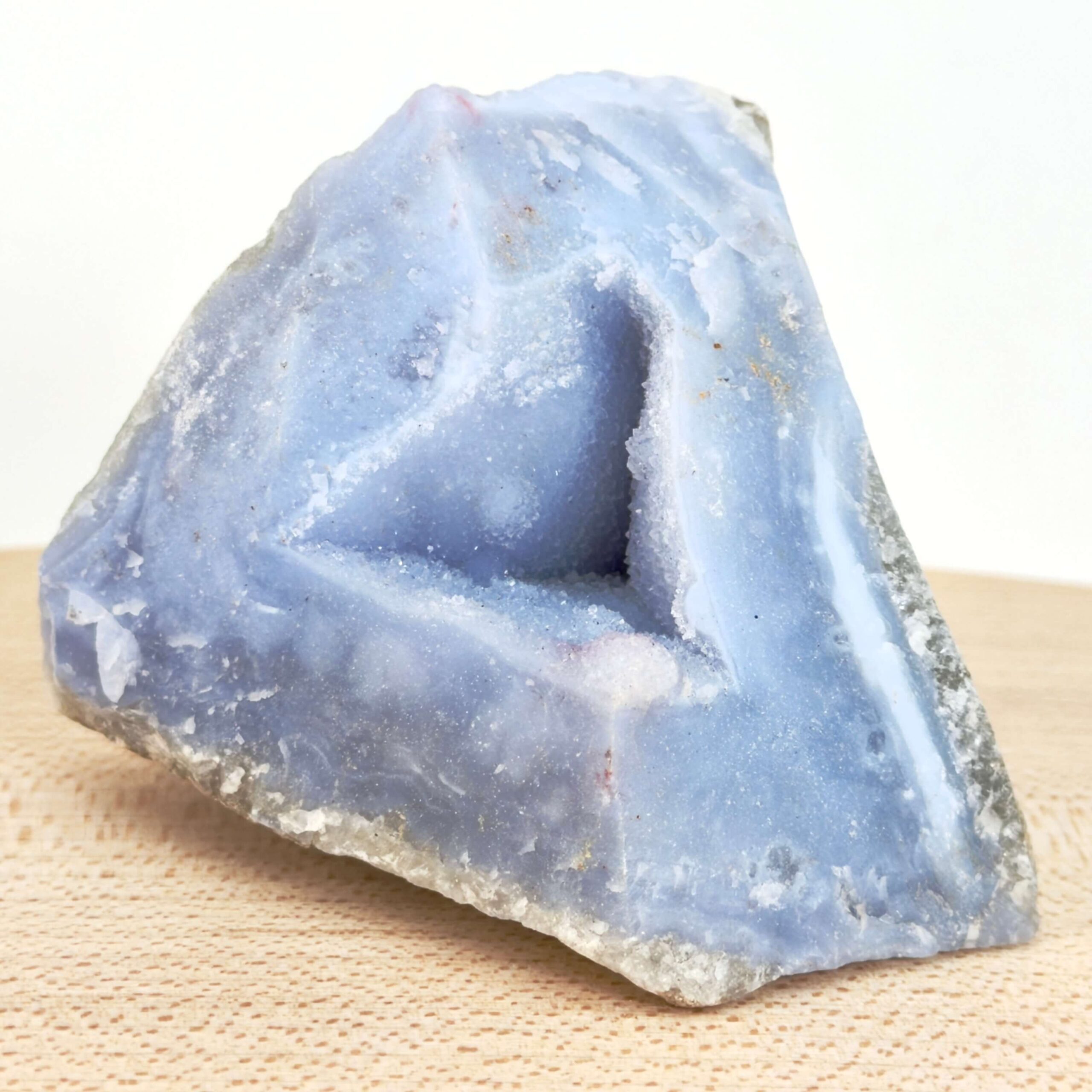 Når Blondeagat bevares i sin rå form, får man et tydeligt indblik i stenens naturlige struktur. De blå og hvide lag kan danne elegante mønstre, som ofte minder om fine tekstiler eller blonder. Rå Blondeagat er derfor ikke kun en krystal, men også et lille stykke naturhistorie.