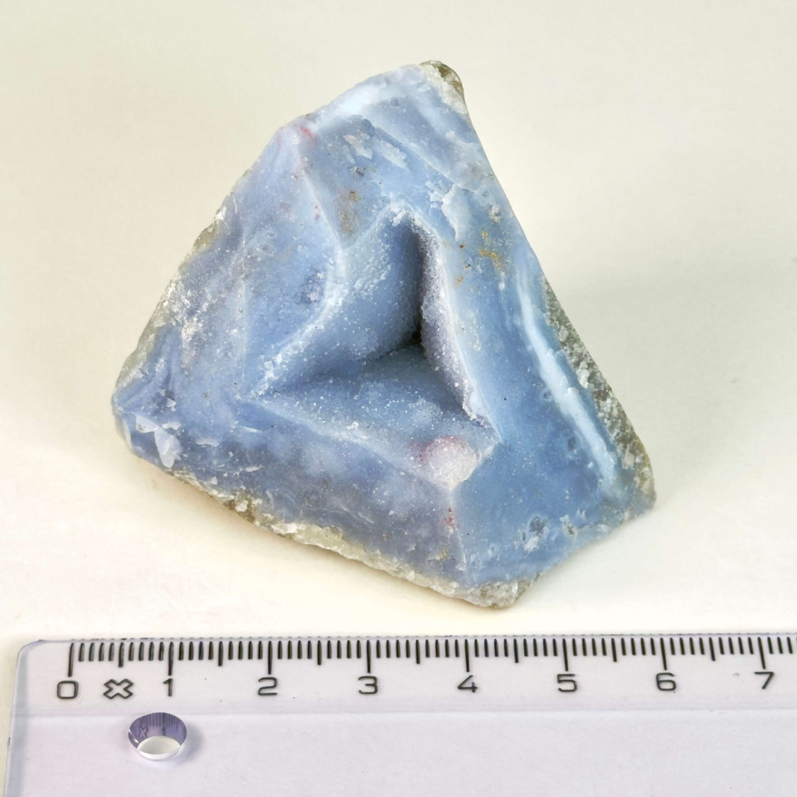 Når Blondeagat bevares i sin rå form, får man et tydeligt indblik i stenens naturlige struktur. De blå og hvide lag kan danne elegante mønstre, som ofte minder om fine tekstiler eller blonder. Rå Blondeagat er derfor ikke kun en krystal, men også et lille stykke naturhistorie. Denne Blondeagat Rå er i kategorien one-of-a-kind, hvilket vil sige, at det er krystallen på billederne du køber. Prisen er for denne éne krystal. Krystallen måler 6 x 4,5 x 4 cm og vejer 92g.