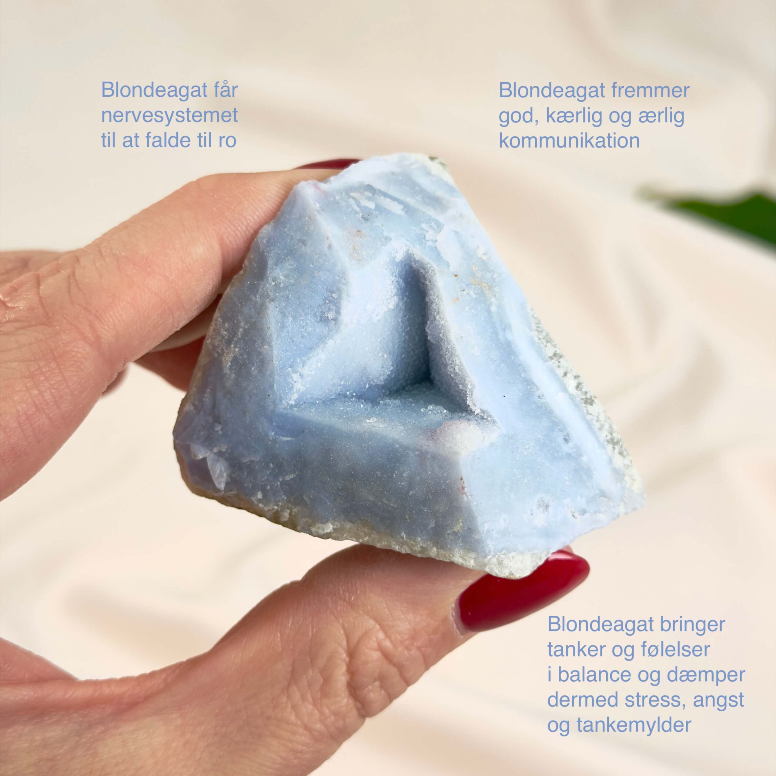 – Blondeagat symboliserer ro, balance og ærlig kommunikation. Den fine blå farve forbindes med fred i sindet og klarere tanker.