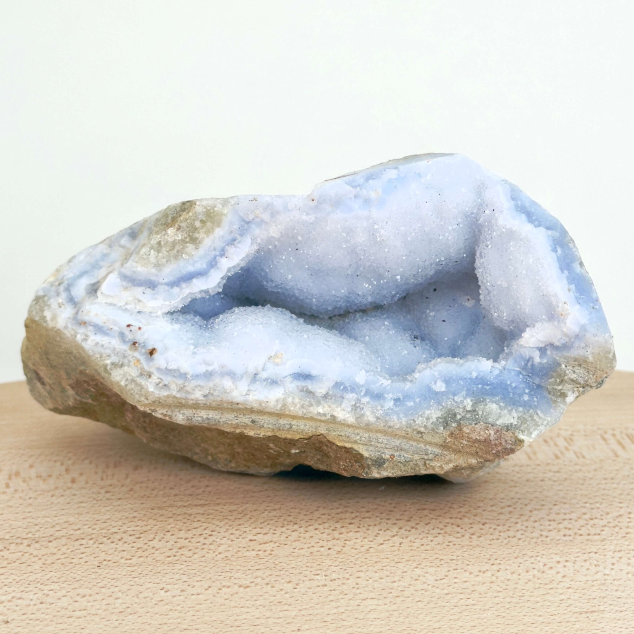 Blondeagat Rå er en smuk blå krystal, der er kendt for sine fine bånd af lys blå og hvid. Stenen kaldes ofte også Blue Lace Agate, og dens rolige farver har gjort den til en af de mest populære blå krystaller i moderne krystalbrug. Når man taler om blondeagat betydning, forbindes stenen især med ro, klarhed og harmonisk kommunikation.
