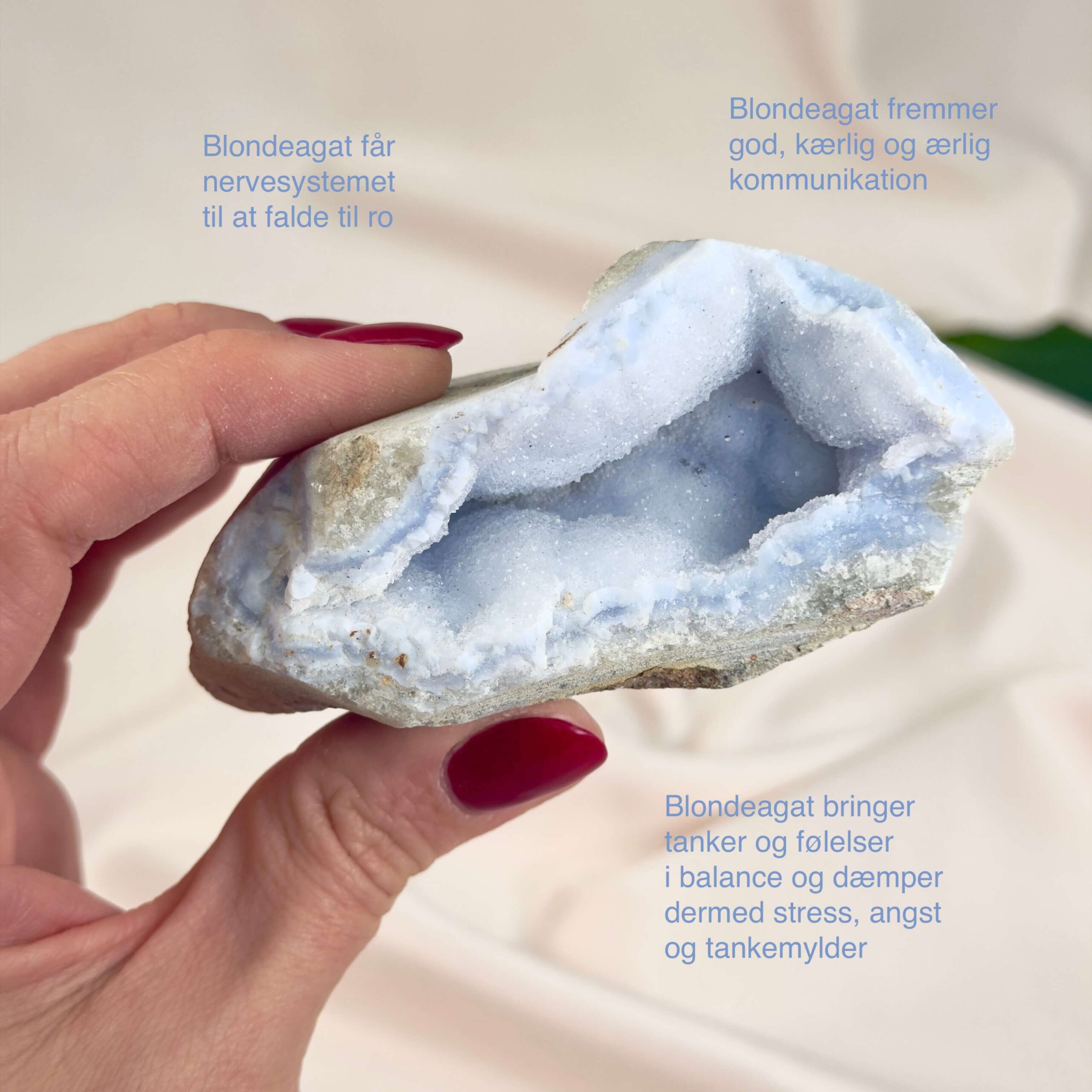 – Blondeagat bruges ofte til at skabe mental ro, klarhed og bedre kommunikation. Krystallen forbindes især med halschakra og hjælper med at udtrykke tanker og følelser klart.