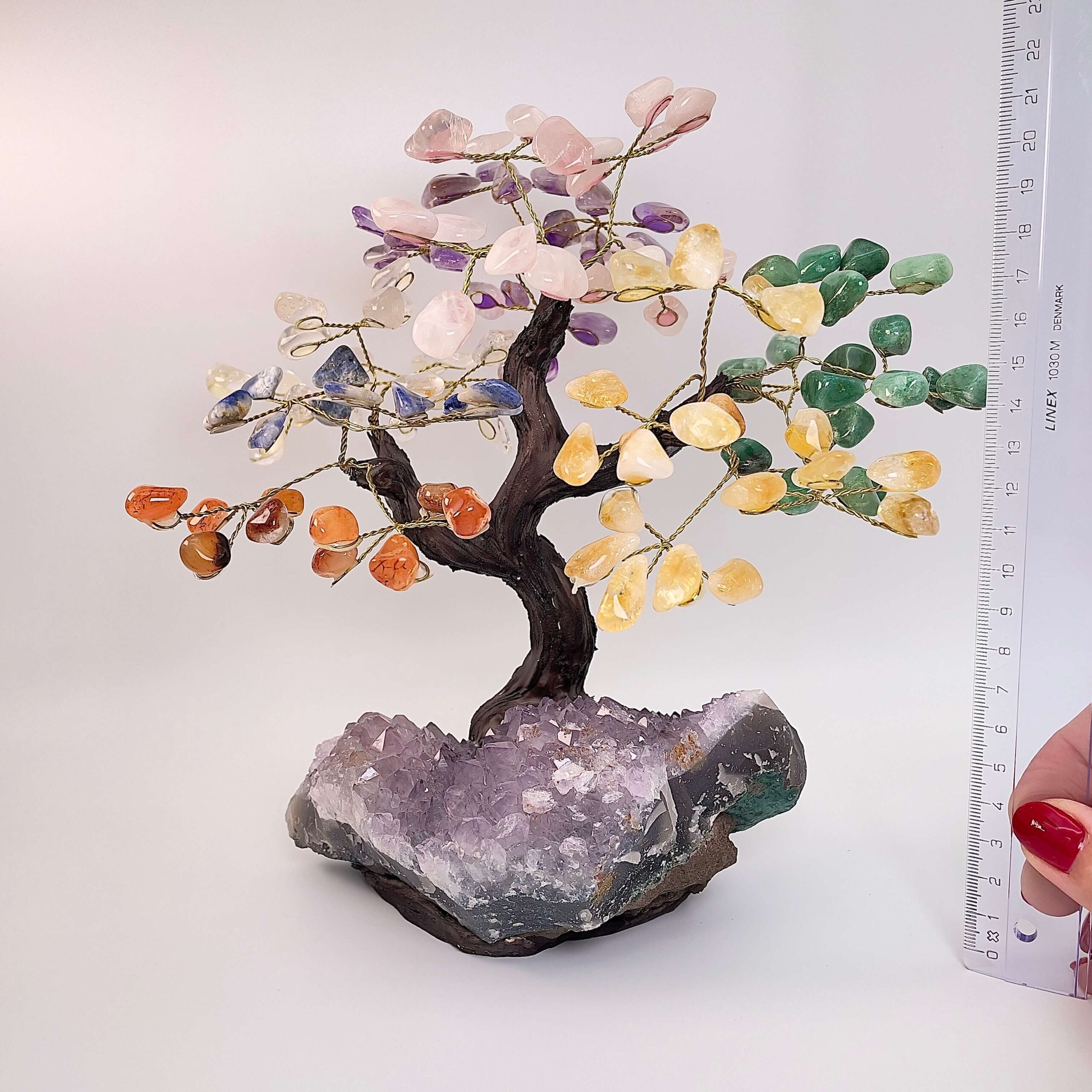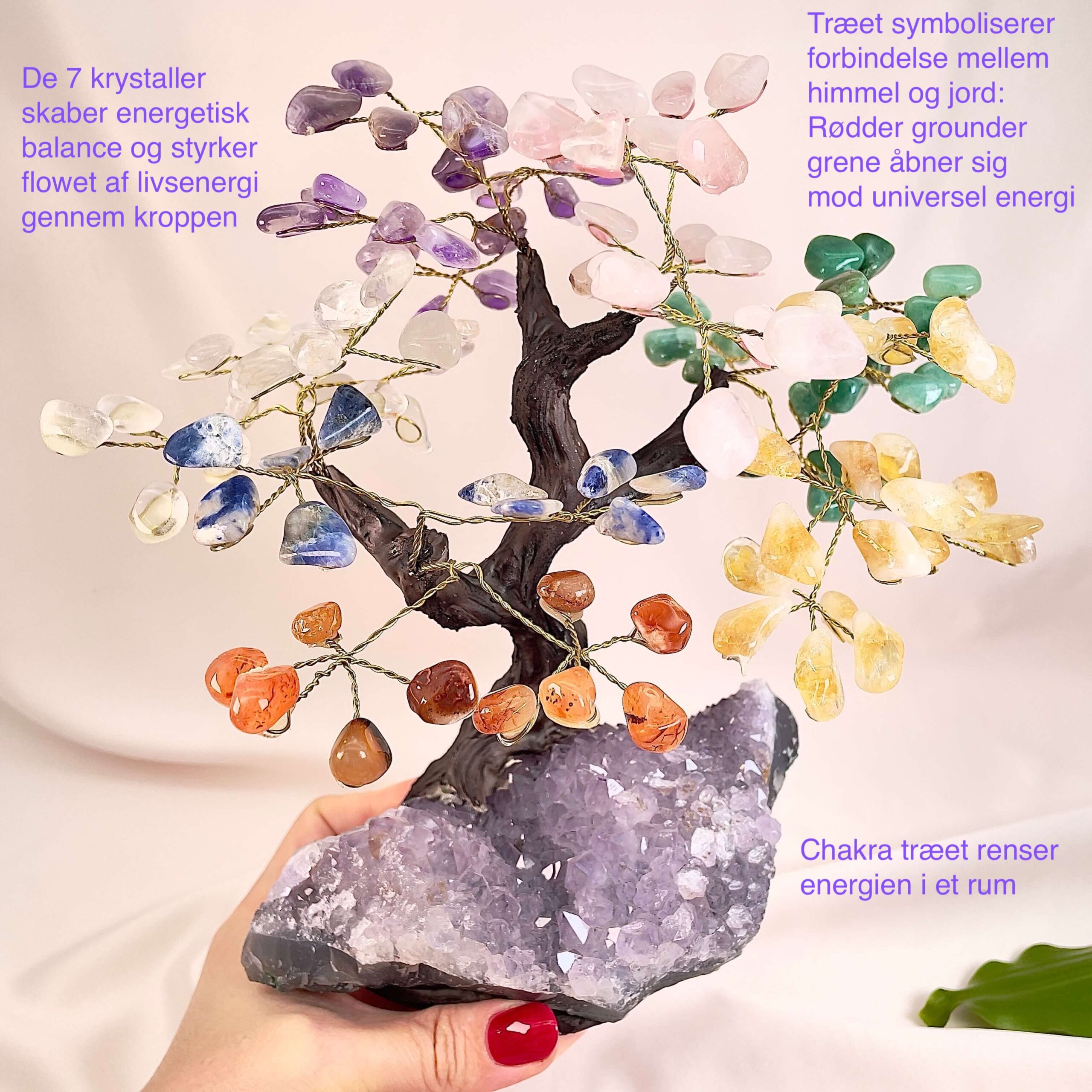 Træets form repræsenterer vækst, styrke og forbindelsen mellem himmel og jord. Rødderne står for grounding, stammen for stabilitet og grenene for nye muligheder. Når krystallerne tilføjes, skabes et harmonisk energiflow gennem hele træet – præcis som chakraerne i kroppen. Træet bliver et smukt symbol på balance, selvudvikling og indre styrke.