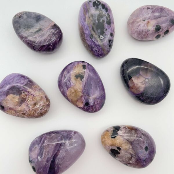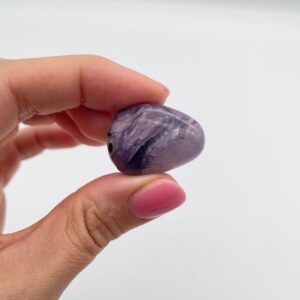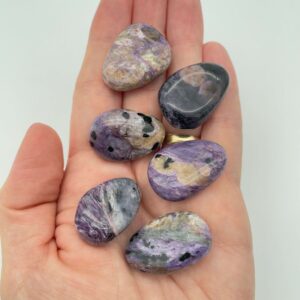 Disse Charoit er håndpoleret og derfor klare, glatte og meget smukke i deres udformning. De er afrundet i hjørnerne og perfekte til at have med som lommesten. Pga. håndpoleringen er den lækker at røre ved og ligger godt i hånden, hvilket giver en beroligende, “stressball”-agtig effekt. Den fungerer super godt både til mindful berøring og som støtte i meditation.