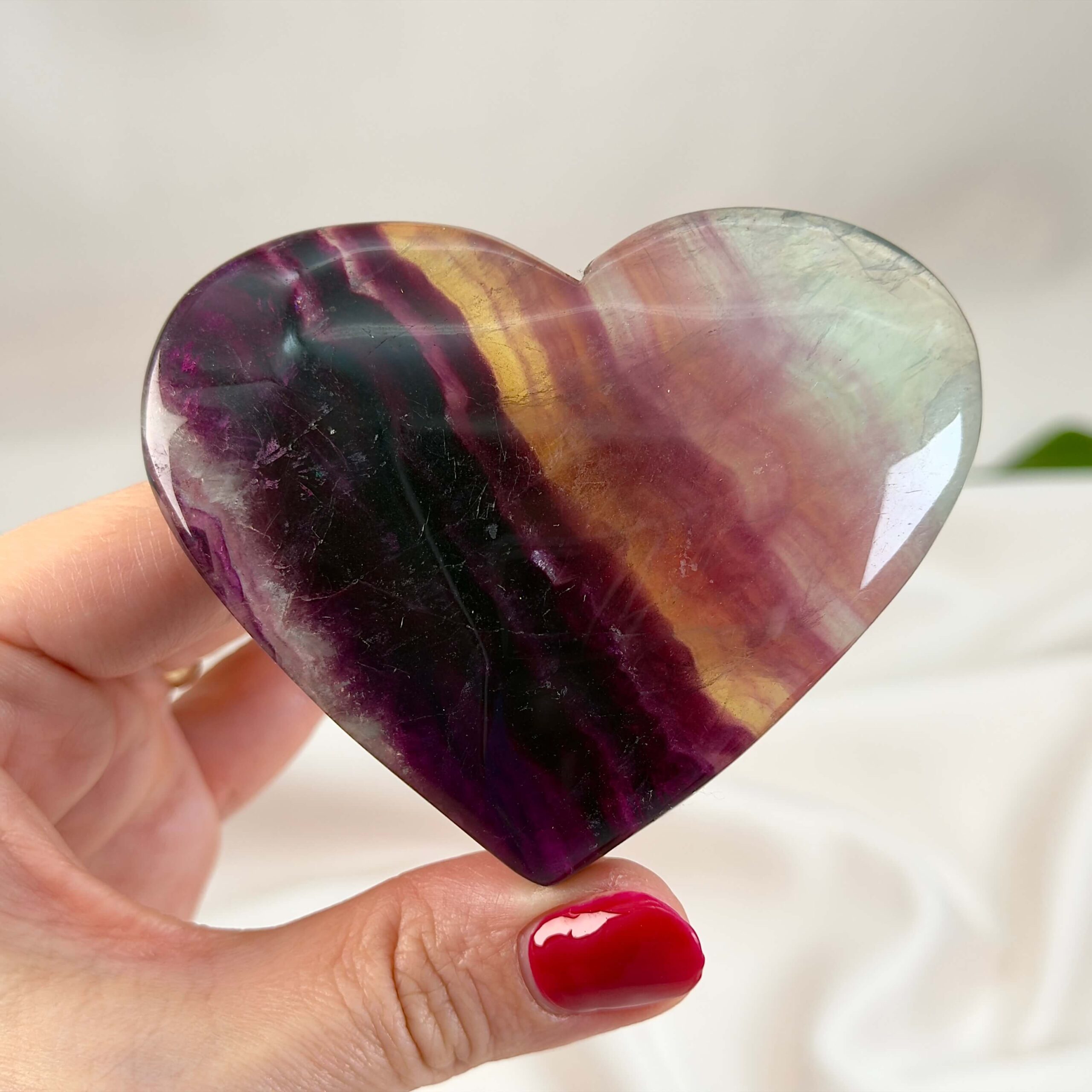 Denne smukke Fluorit Regnbue er en af de mest farvestrålende og alsidige krystaller i krystalverdenen. Den er elsket af mange både pga. af sine egenskaber, men i særdeleshed også pga. sine mange flotte farver og farvespil. Fluorit Regnbue findes i smukke bånd af lilla, grøn, blå, gul og gennemsigtige lag, som fanger lyset og lader det danse indeni stenen. Fluorit Regnbue giver klarhed, fokus og beskyttelse. Den er særlig kendt for at hjælpe med at sortere tankerne og følelserne, opløse tankemylder og skabe overblik, så du kan fokusere på det, der er vigtigt og det, som virkelig betyder noget. Fluorit Regnbue hjertet er i kategorien one-of-a-kind, hvilket betyder at det er hjertet på billedet du køber. Prisen er for dette ene hjerte. Hjertet måler 8,5 cm og vejer 203g.