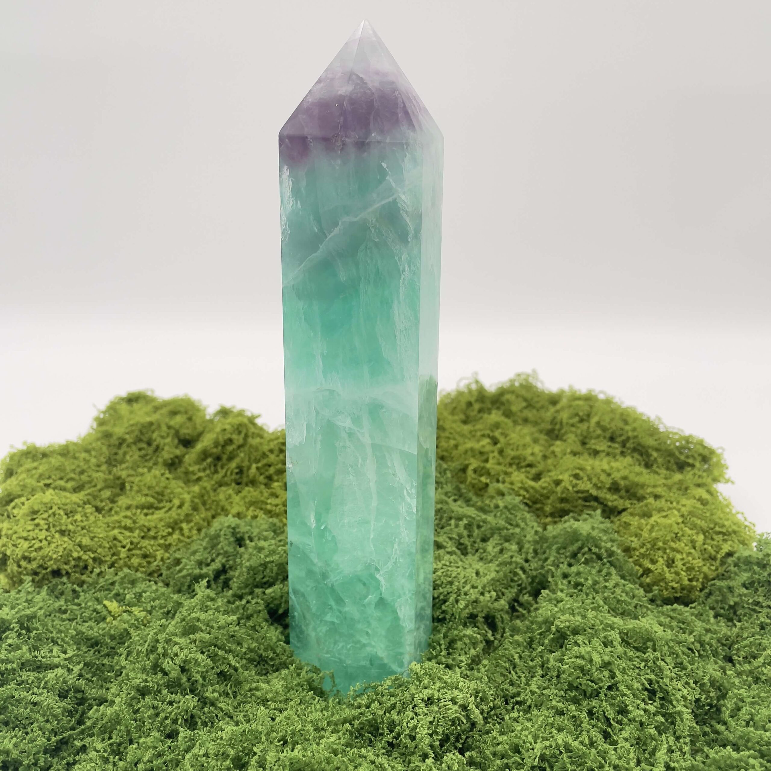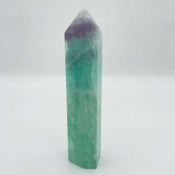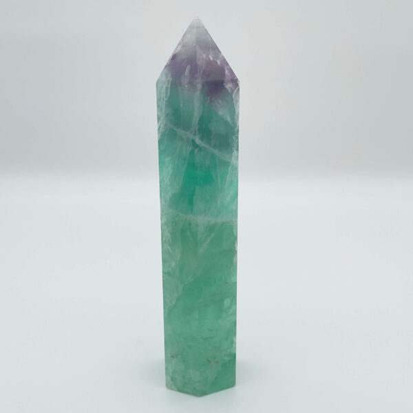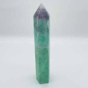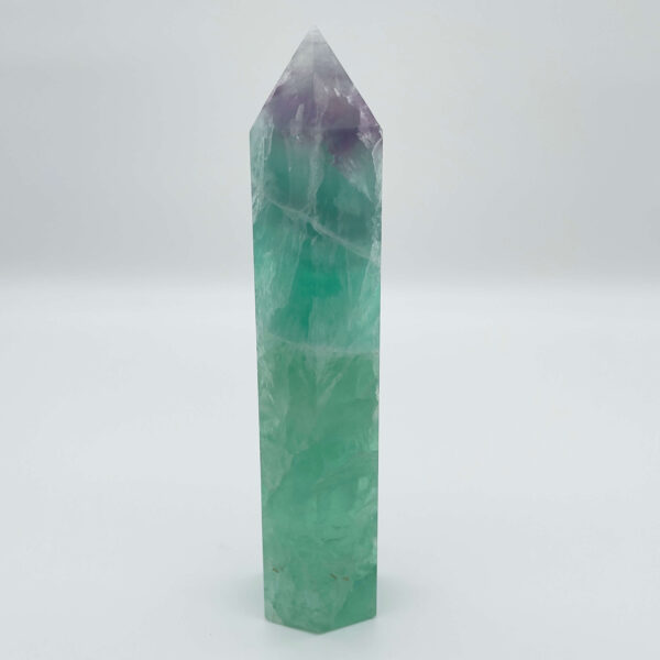 Denne Regnbue Fluorit er udformet som et tårn. Det specielle ved netop denne form er, at den spidse top leder energien opad eller ud i det rum, hvor den står. Den er god at placere i hjemmet eller på et alter for at rense og stabilisere energien i rummet.