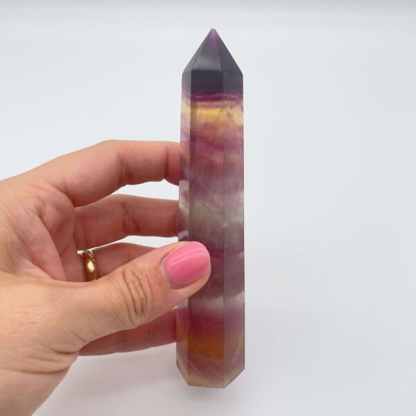 Denne smukke Regnbue Fluorit er en af de mest farvestrålende og alsidige krystaller i krystalverdenen. Den er elsket af mange både pga. af sine egenskaber, men i særdeleshed også pga. sine mange flotte farver og farvespil. Regnbue Fluorit findes i smukke bånd af lilla, grøn, blå, gul og gennemsigtige lag, som fanger lyset og lader det danse indeni stenen. Regnbue Fluorit giver klarhed, fokus og beskyttelse. Den er særlig kendt for at hjælpe med at sortere tankerne og følelserne, opløse tankemylder og skabe overblik, så du kan fokusere på det, der er vigtigt og det, som virkelig betyder noget. Dette Regnbue Fluorit Tårn er i kategorien One-Of-A-Kind, som betyder at det er tårnet på billedet du køber. Prisen er for den éne.