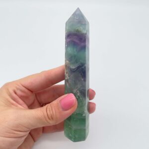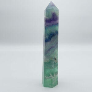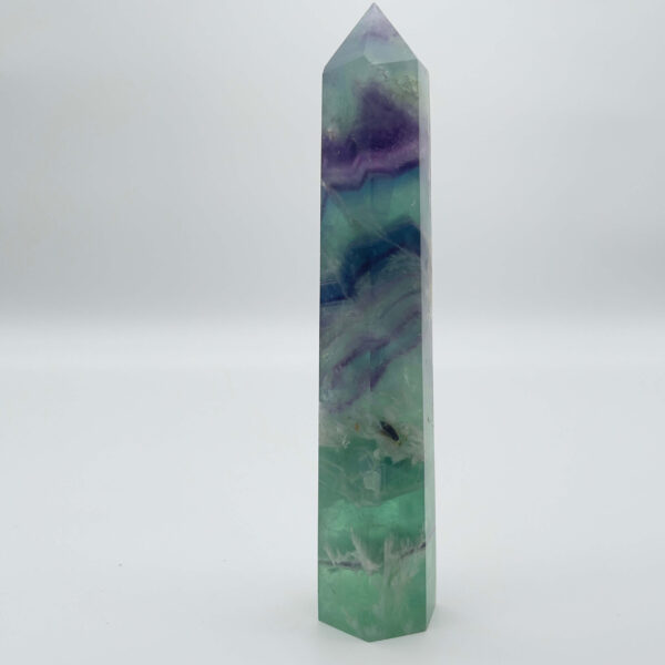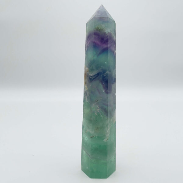 Denne smukke Regnbue Fluorit er en af de mest farvestrålende og alsidige krystaller i krystalverdenen. Den er elsket af mange både pga. af sine egenskaber, men i særdeleshed også pga. sine mange flotte farver og farvespil. Regnbue Fluorit findes i smukke bånd af lilla, grøn, blå, gul og gennemsigtige lag, som fanger lyset og lader det danse indeni stenen. Regnbue Fluorit giver klarhed, fokus og beskyttelse. Den er særlig kendt for at hjælpe med at sortere tankerne og følelserne, opløse tankemylder og skabe overblik, så du kan fokusere på det, der er vigtigt og det, som virkelig betyder noget. Dette Regnbue Fluorit Tårn er i kategorien One-Of-A-Kind, som betyder at det er tårnet på billedet du køber. Prisen er for den éne.