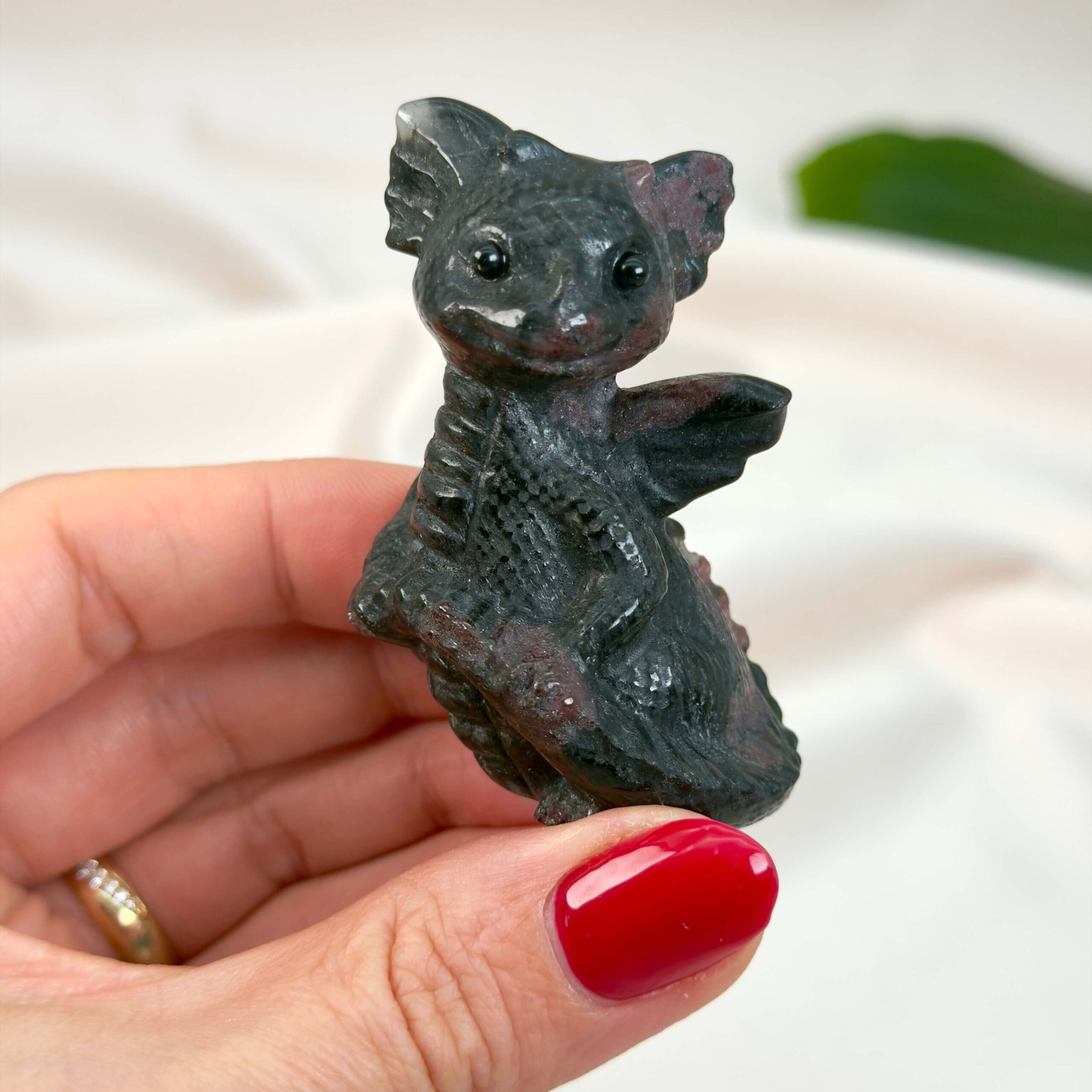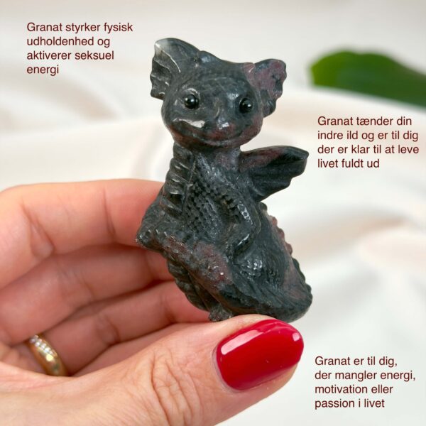 Denne Granat Babydrage er i kategorien one-of-a-kind, hvilket vil sige, at det er krystallen på billedet du køber. Prisen er for den éne Figur. Dragen måler 6 cm og vejer 78g.
