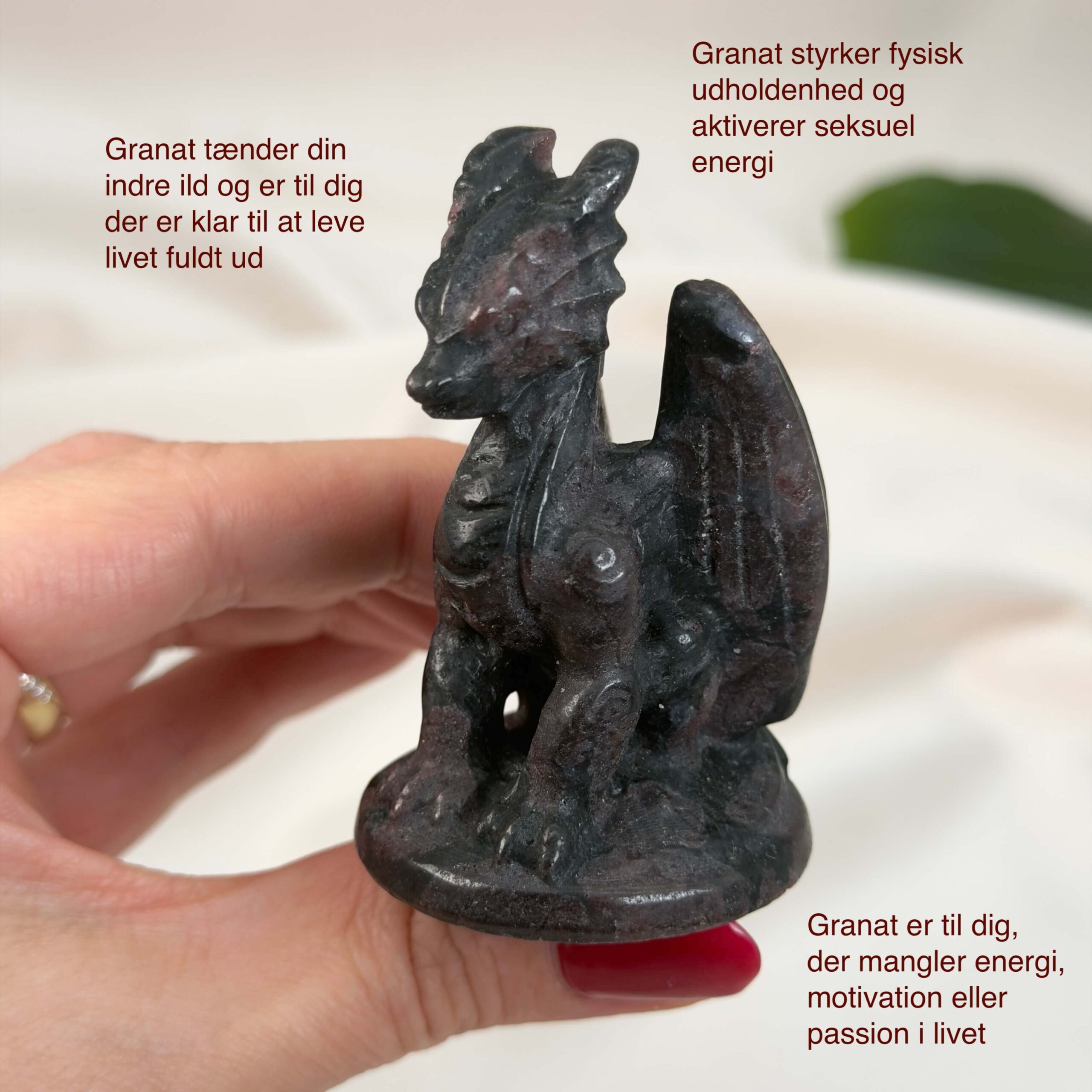 Denne Granat Drage er i kategorien one-of-a-kind, hvilket vil sige, at det er krystallen på billedet du køber. Prisen er for den éne Figur. Dragen måler 6,5 cm og vejer 100g.