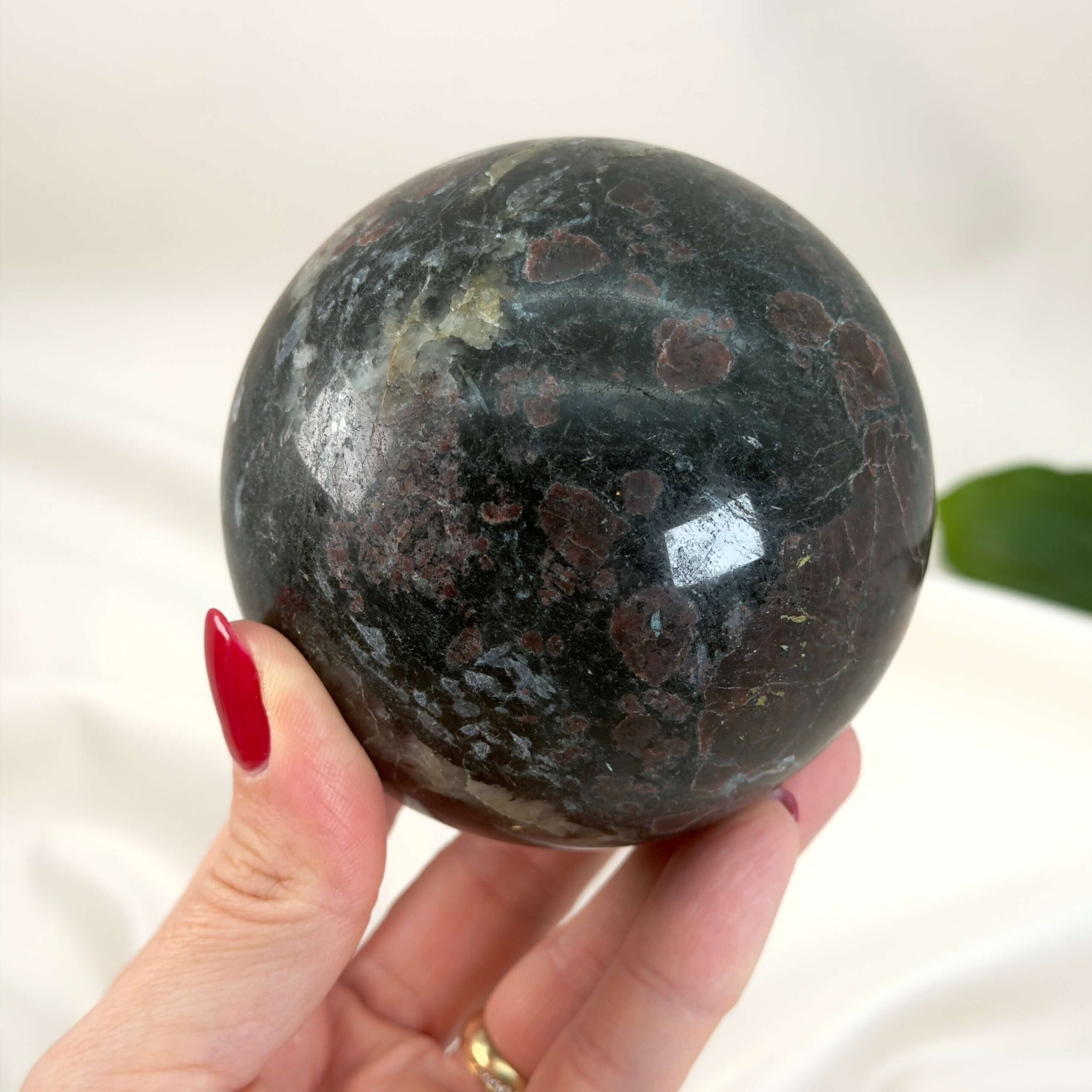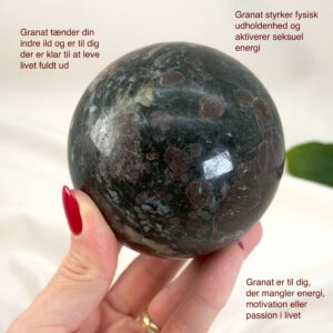 Granat Kugle arbejder med passion, vitalitet og manifestation. Stenen har en kraftfuld, livgivende energi der vækker din indre ild. Den støtter dig i at forfølge dine drømme med styrke og udholdenhed. Granat minder dig om, at livet kræver handling og engagement for at blomstre.