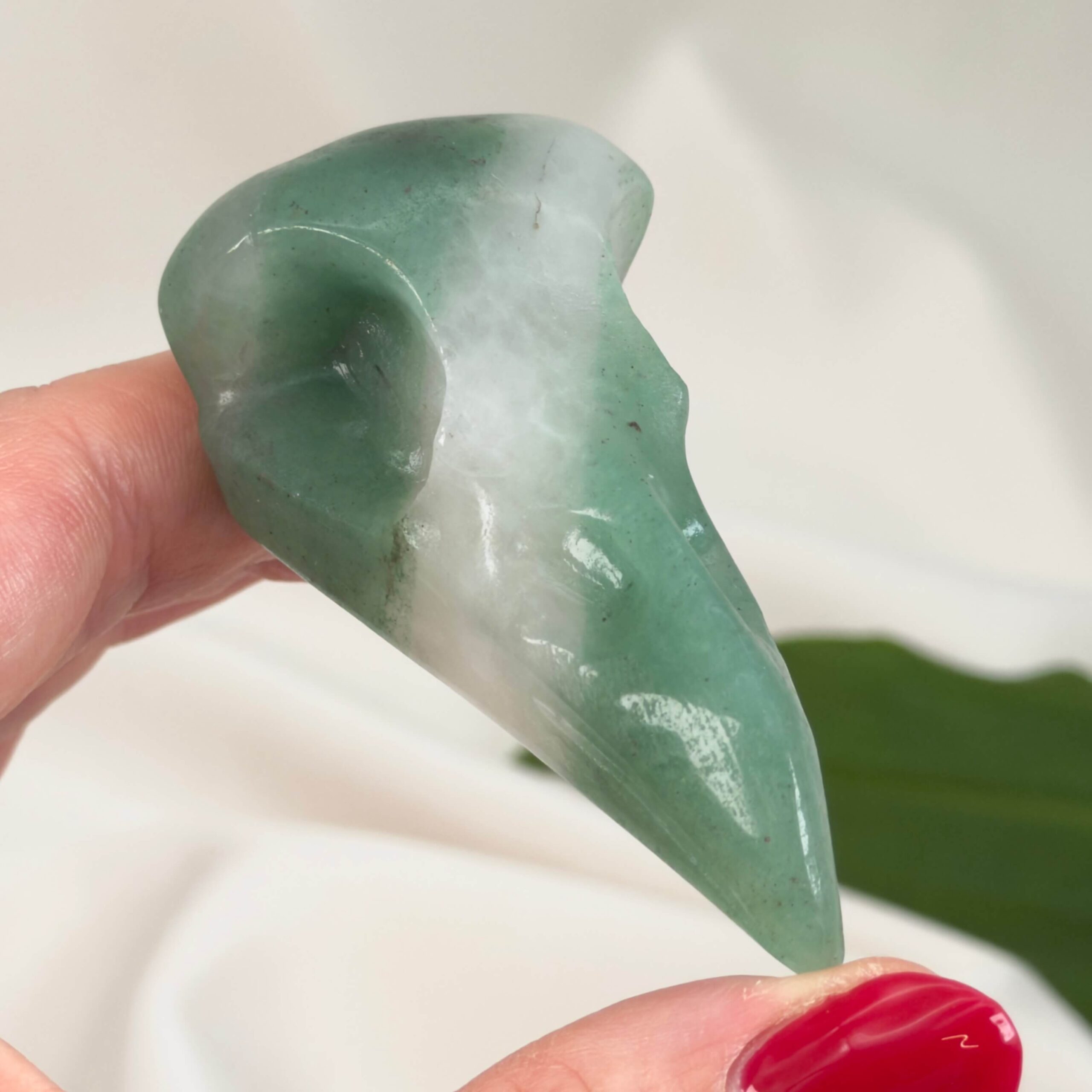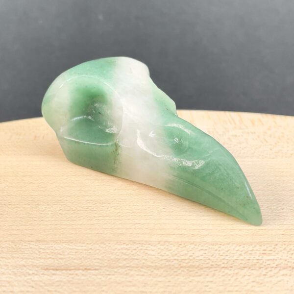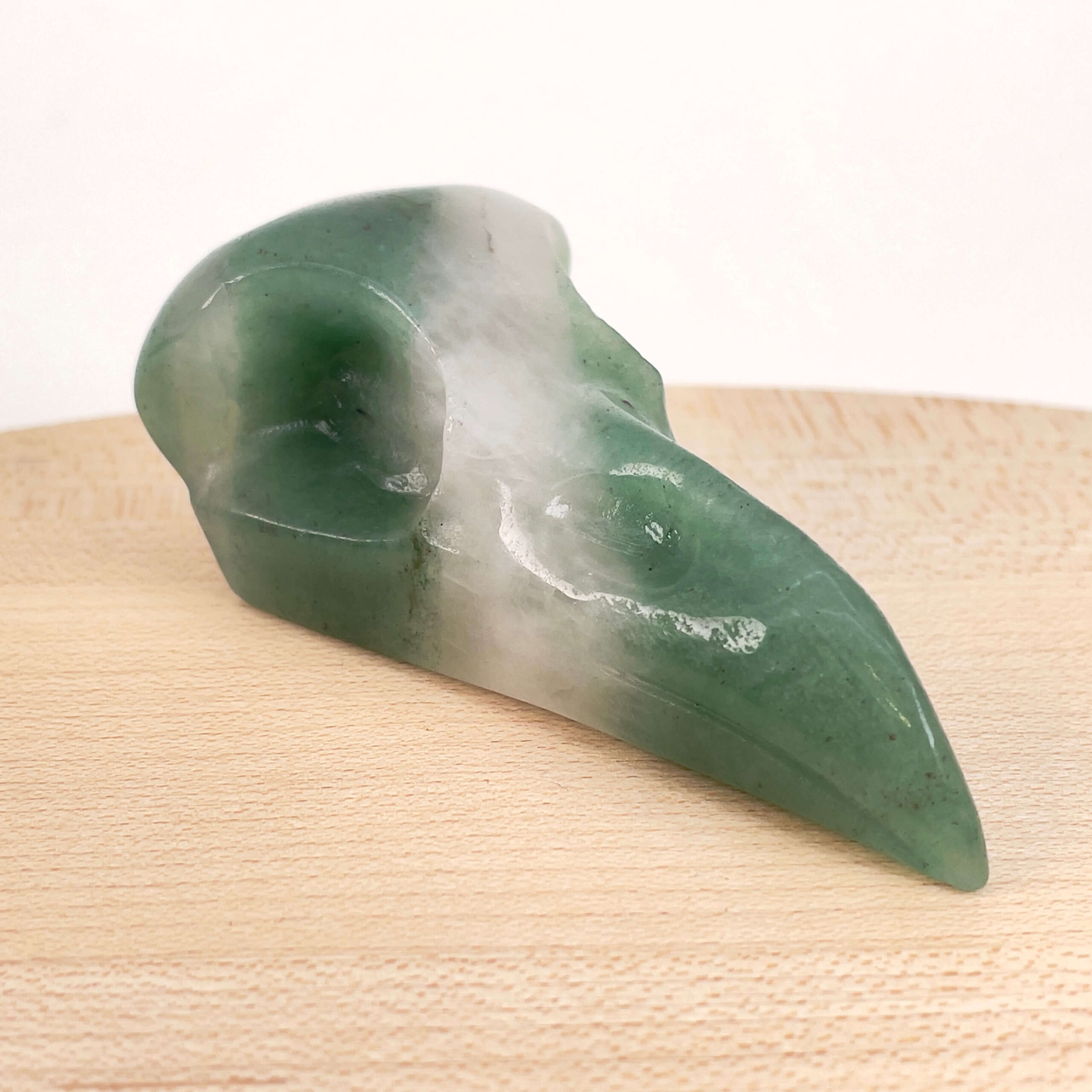 Grøn Aventurin Ravnenæb er en unik krystaludskæring, hvor form og farve arbejder sammen i en harmonisk helhed. Den glatte finish fremhæver stenens naturlige variationer, mens den markante form giver figuren et kraftfuldt udtryk. Grøn Aventurin Ravnenæb er ideel som en dekorativ krystal med kant og personlighed.