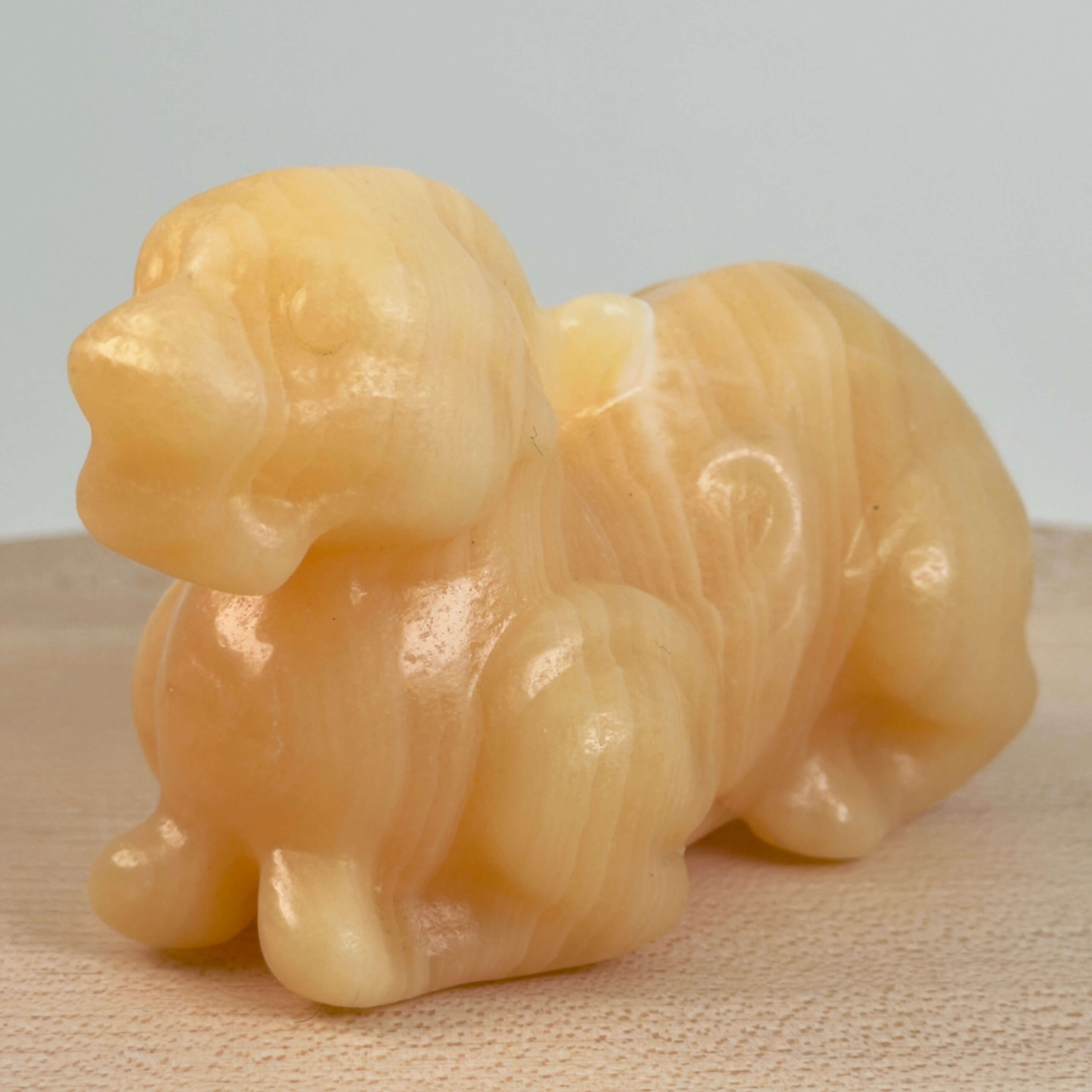 Gul Calsit Foo Dog arbejder med solar plexus, hvor den styrker personlig handlekraft.